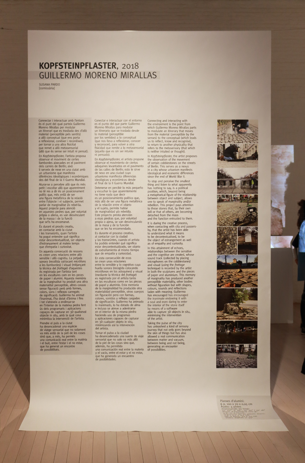 En esta consecución de ecos, se crean unas relaciones entre lo sensible y lo cognitivo cuya huella sonora (recogida colocando micrófonos en los adoquines) y visual (mediante la técnica del frottage) el artista ha registrado en las esculturas y piezas de papel y aluminio. Esta memoria de la marginalidad ha producido otra materialidad perceptible, otros cuerpos sin figuración pero con formas, colores, sonidos y reflejos cargados de significación.