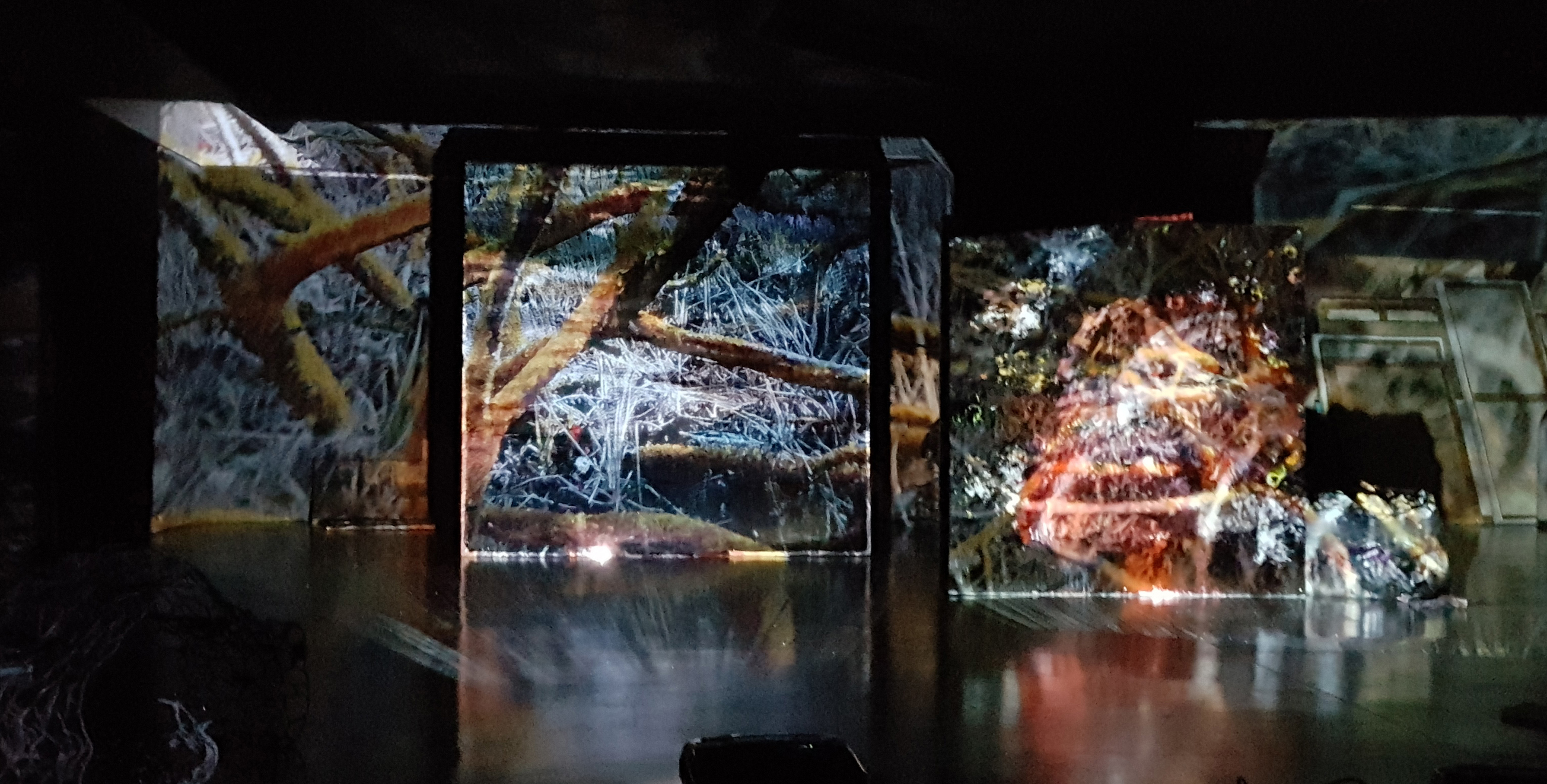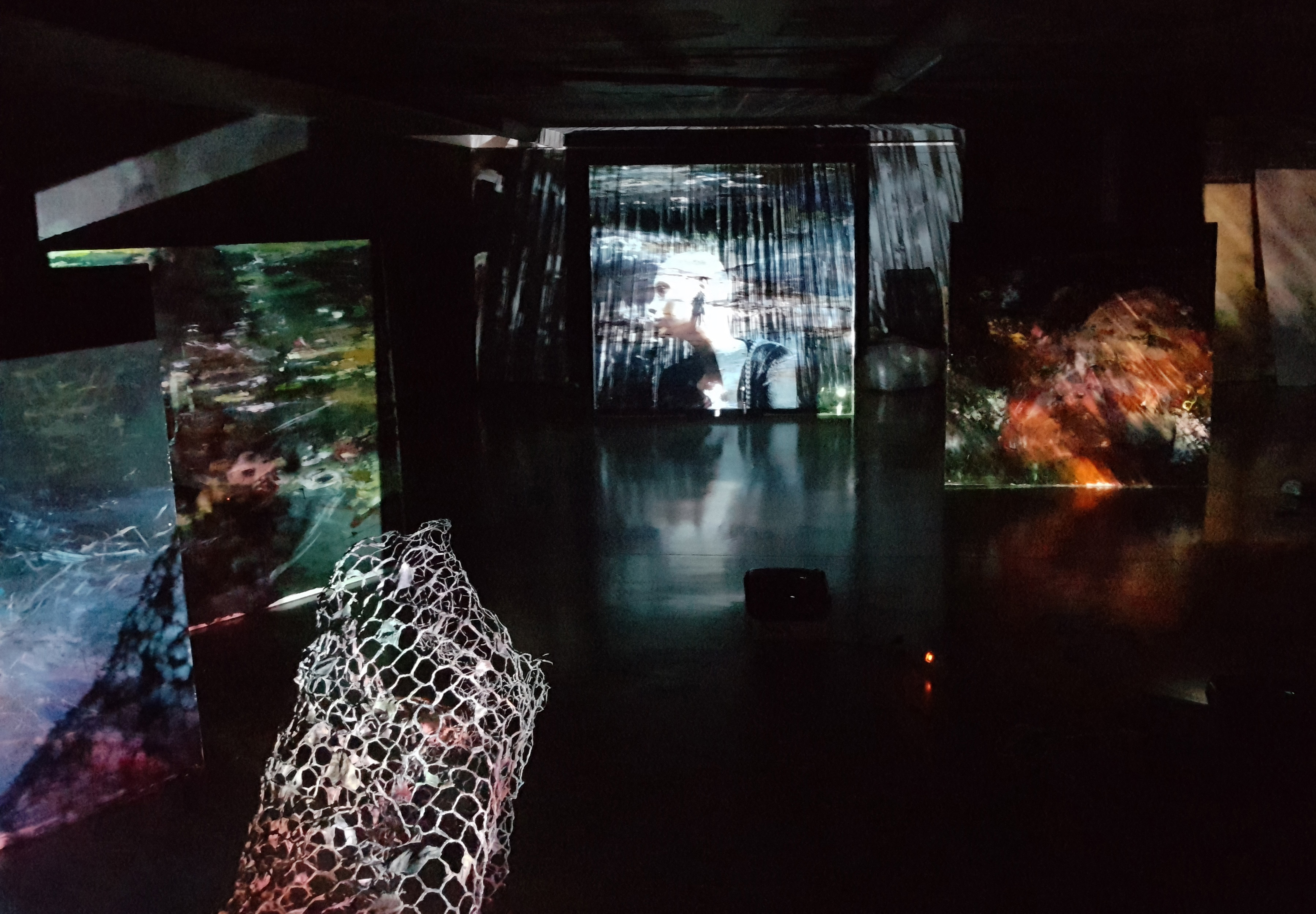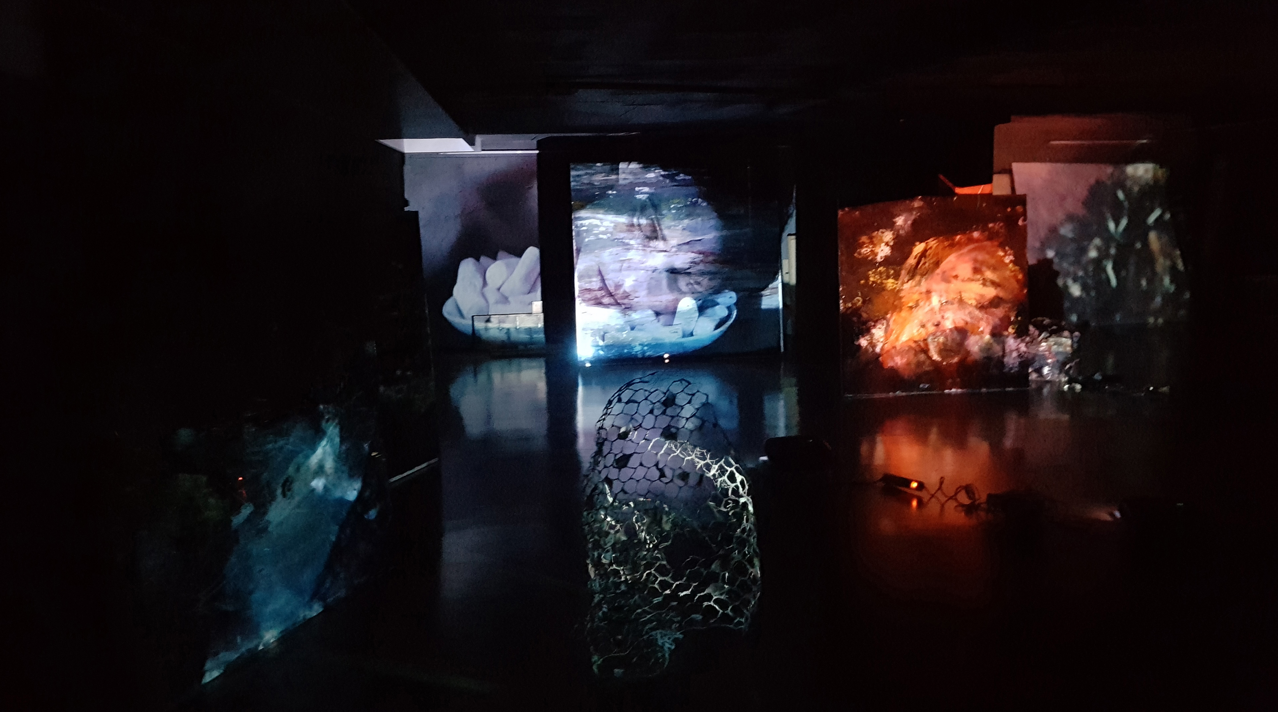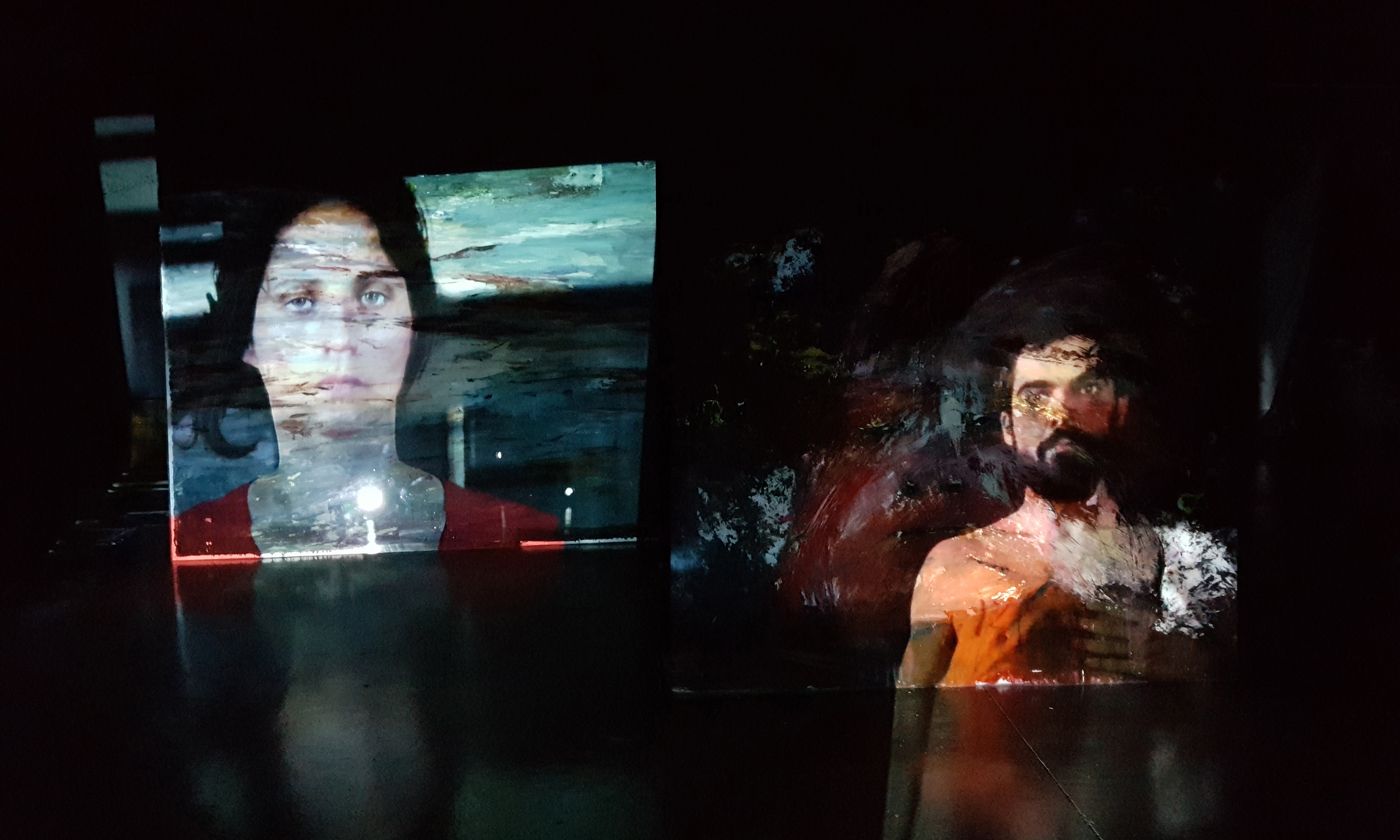 Tanto las obras pictóricas de Rosa como los vídeo arte de Manuel, tomados por separado, son piezas acabadas con una realización formal y conceptual que, al ser observadas con una mirada lenta y profunda, transmiten sus conceptos e ideas de manera efectiva. Son representaciones ordenadas, emocionales y conscientes. Sin embargo, al disponerlas de manera anárquica y proyectarlas todas al unísono en una sala de paredes color gris petróleo, se crea un caos en medio de la oscuridad de la caverna; el espectador dentro de la instalación apenas es capaz de vislumbrar retazos incongruentes que dejan ver parcialmente las piezas, en medio de un jaleo sonoro donde poco se distingue. Ahí dentro se percibe el conflicto y el desacuerdo. Nos enfrentamos directamente con la colisión que producen el caos por la excesiva información, la oscuridad de la ignorancia y los destellos que podemos vislumbrar de conocimiento válido.