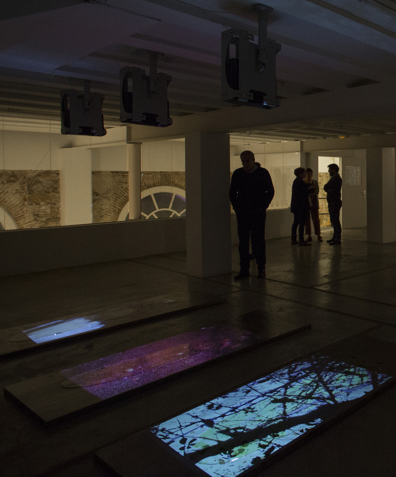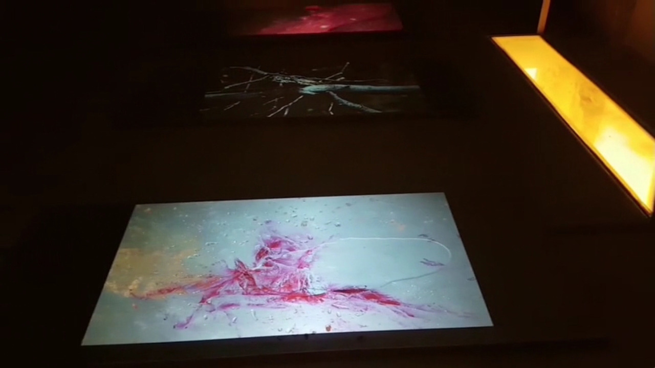 cuatro elementos ancestrales: tierra, agua, aire y fuego, con la terna sacra que simboliza la perfección y el equilibrio. Al unir el 4 y el 3 nos da el número 7 que alude a la totalidad del universo en movimiento. Rosa presenta la materialidad de tres chapas de hierro dispuestas en el suelo, en representación de la tierra como símbolo de fertilidad, sobre las que derrama agua, elemento que hace posible la vida; Manuel proyecta 7 vídeo arte de abstracciones de la naturaleza, siendo la luz metáfora del fuego mientras que el sonido se sirve del aire para desplazarse. El conjunto forma una instalación que fusiona todos los elementos para favorecer la evolución de la conciencia.