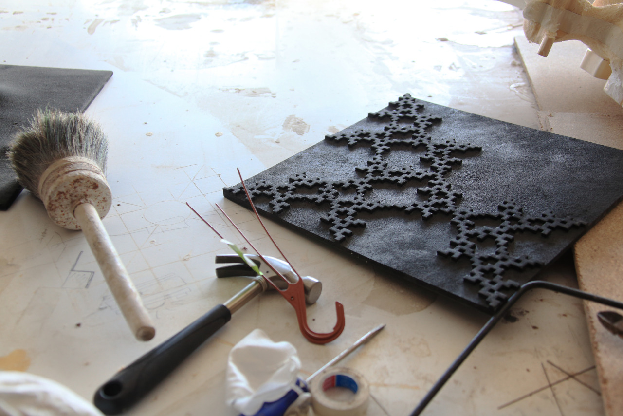 Esa fisura abierta entre caos y equilibrio componen los aspectos más significativos del conjunto de su obra, tan evidente en la serie Laberintos, enredados y claros al unísono. Los laberintos de Pous son como el cerebro o la propia vida, estructuras que se retuercen y enroscan sobre sí mismas, caminos que se repiten y esquemas de los que supuestamente no se puede salir. Desde el mito se representa el laberinto como un lugar sombrío en el que uno puede adentrarse fascinado y seducido por el aspecto lúdico, sin embargo aterra su enorme carga amenazante. Pero los laberintos que horadan la superficie del lienzo de Robert o que dibuja en su plantillas construyen formas no jerárquicas ya que ha dejado la mano supeditada al azar, que actúe sin control racional para concebir imágenes más puras y autónomas. Al no someterlas a ningún poder son formas que no se cierran, no están sujetas a ningún dogma y los confusos recovecos contienen múltiples posibilidades. Paradójicamente el caos de la creatividad se reorganiza creando imágenes libres e inocentes que conceden toda una suerte de combinaciones, conexiones y relaciones.