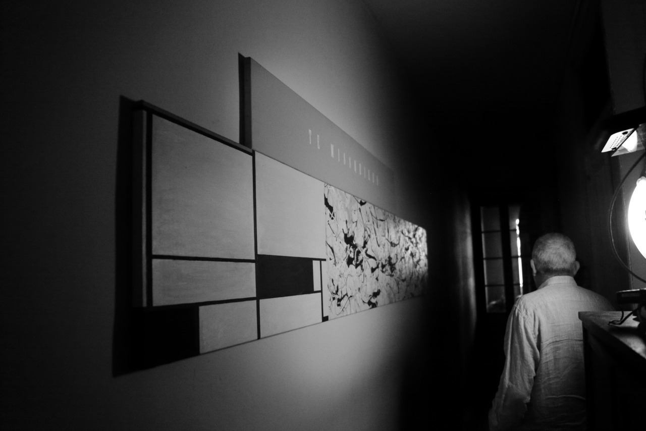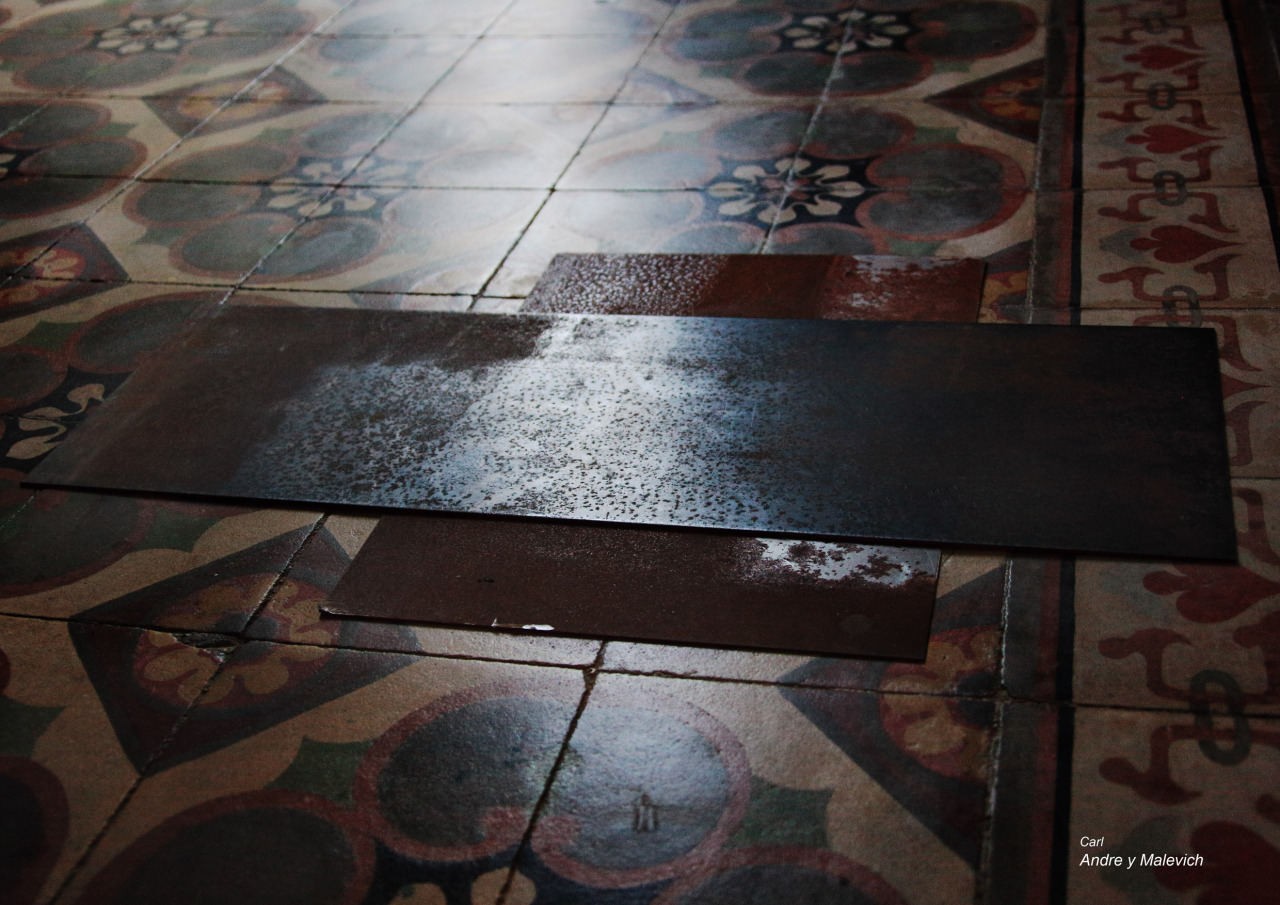 El diálogo propuesto en la tercera obra que presenta en esta exposición es un ten con ten entre Carl Andre y Malevich. Esta obra surge después de meses viendo en el rellano de su casa las chapas metálicas dejadas por unos albañiles para proteger el trabajo que habían realizado en el suelo. Ahí quedaron olvidadas formando parte del paisaje vecinal hasta que Alberto reconoció a otro de los artistas cuyas estructuras han supuesto una capa reveladora en la experiencia de su palimpsesto personal; nos referimos a Carl Andre. Rescató las planchas expresamente para incorporarlas a esta exposición valorando, como hizo Andre, un material sin nobleza, una obra simple, modesta, ordenada, sin concesiones a ser interpretada, añadiéndole un sentido extra por la conexión entre arte y cotidianidad.