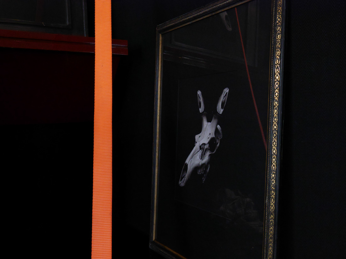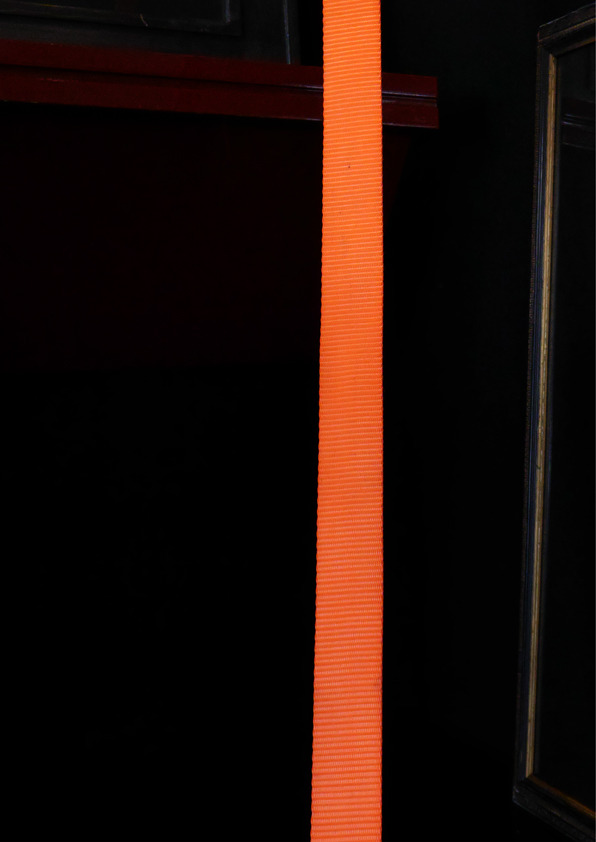 Para ello ha utilizado una correa de sujeción naranja fosforescente de siete metros aproximadamente que fijada en una pared de la sala llega hasta la calle quedando suelta, sin tensión, remarcando una unión sin tiranteces ni angustias, sólo un intercambio fértil.