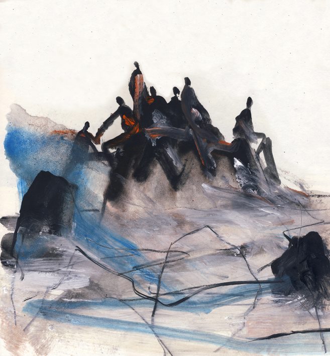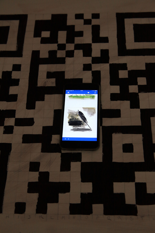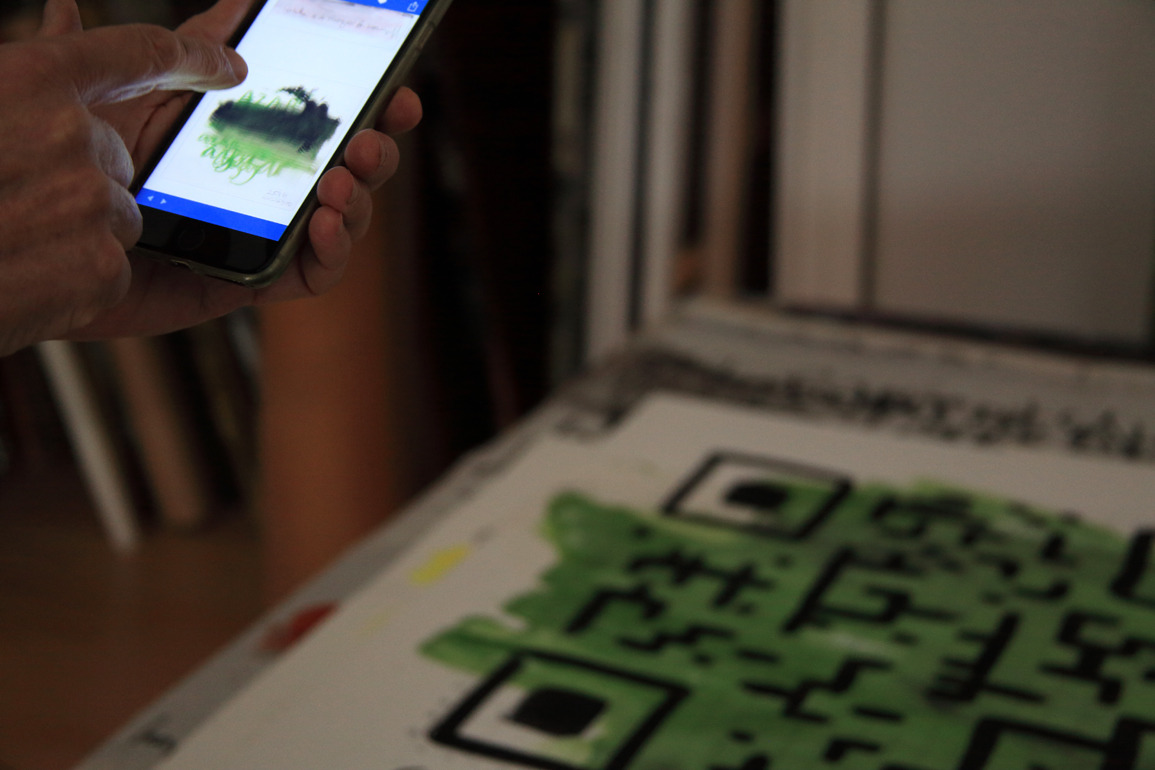Ahora ha querido cerrar el círculo dándole una vuelta de tuerca más. Esta vez el código QR lo ha realizado pictóricamente; para ello ha ido ensayando desde una ejecución fiel al propio código, siguiendo las líneas de demarcación y rellenado al modo en que se representa el sistema de píxeles, pasando por una fase menos encorsetada, donde empieza a permitirse la mancha de color hasta terminar “descontracturando”, según sus propias palabras, es decir soltando el trazo, como hace en toda su obra, para llegar a crear un código QR legible por el escáner que poco tiene que ver con el inicio reglado.