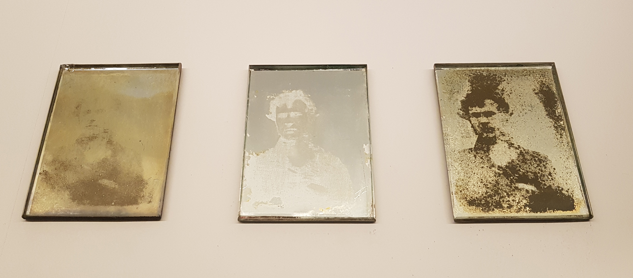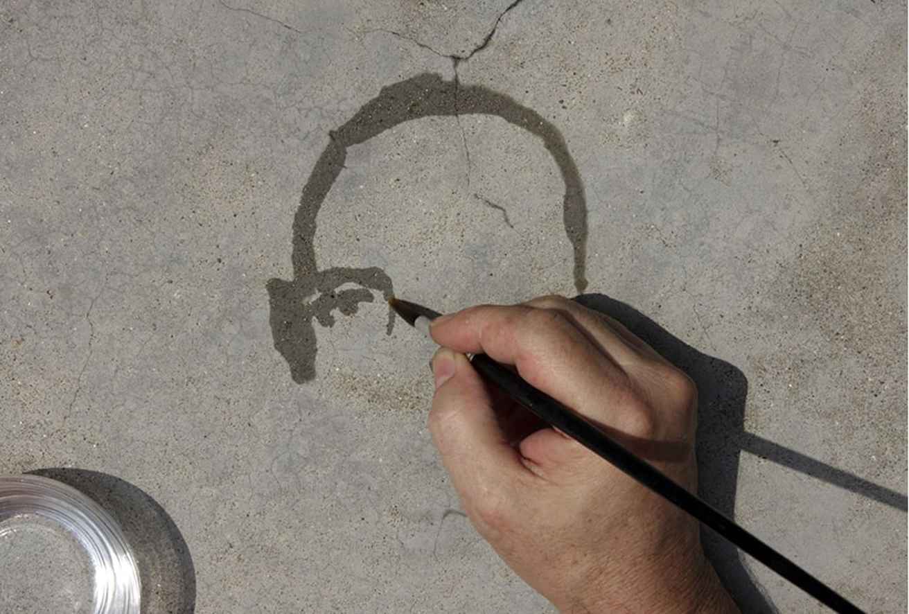Desde la primera obra que abre el recorrido de la exposición se hace presente una cierta provocación al espectador. El artista apremia al receptor, si no está ávido la imagen se esfuma ante sus ojos sin saber qué ha pasado. Se trata de un vídeo donde se observa una mano que pinta con agua sobre una piedra lisa al sol; la mano se afana en reproducir un retrato que el sol siempre termina borrando por evaporación del agua. Esta videoproyección, Re/trato, y el título de la muestra, Des/materializaciones, son la clave que necesitaremos para decodificar una abrumadora realidad: el tiempo acaba con todo y todos/as. Urge mirar para atrapar lo representado antes de que se desvanezca y no quede ningún rastro de existencia.