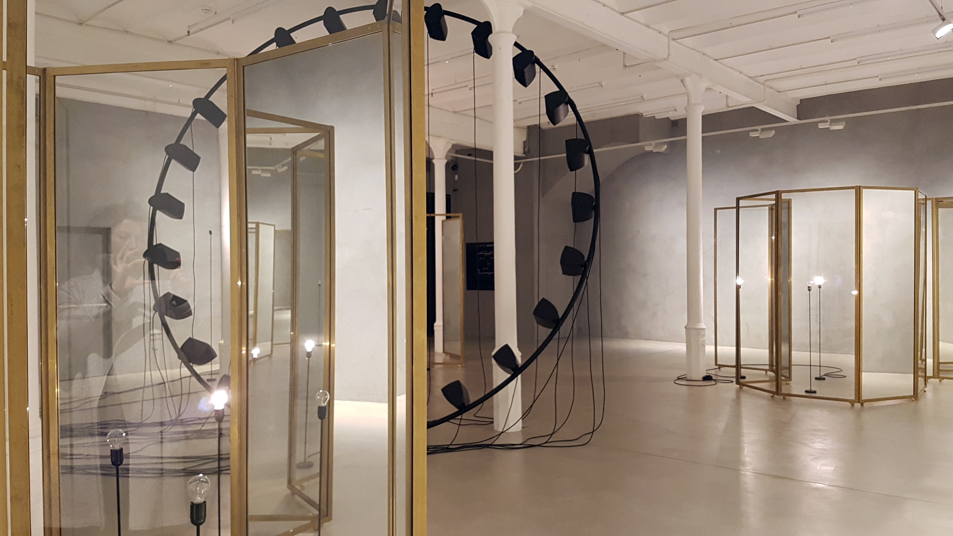 La Escultura principal, Between Glances, distribuye en el centro del espacio tres estructuras geométricas irregulares dispuestas caóticamente; están formadas por la sutil materialidad que proporcionan unos perfiles metálicos que sustentan pantallas de cristal y espejo, por luces de tenues bombillas y marcos huecos. Todos los elementos se repliegan delimitando entornos abiertos y reflejados. En este juego de percepciones, la artista invita a adentrarse en una experiencia sensorial y responder a la cuestión de cómo ocupar el lugar correspondiente, o no, dentro de las coordenadas de espacio/tiempo. Este se abre y se curva activando las alertas ante el fracaso de vislumbrar una sucesión ordenada, continua y simétrica de la realidad; a la vez que se ahoga ante la frustración que produce el paso del tiempo y la incapacidad de fijar una memoria en las construcciones transparentes, reflectantes y vacías.