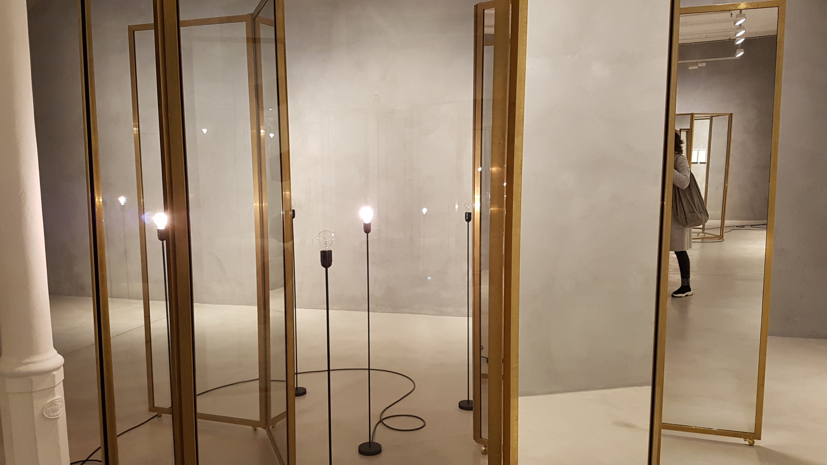 Sin embargo, en esta exposición, la participación del espectador es parcial y malograda ya que la autoexploración en el reflejo es efímera y recuerda insistentemente que somos y no somos al mismo tiempo y en el mismo espacio. Una sensación de ingravidez y pérdida de identidad a pesar del reflejo que se devuelve. Aparecer y desaparecer, al completo o fragmentado, el espectador se pierde y se encuentra en los espejos interrumpidos. En esta instalación queda dislocada la fase del espejo descrita por Lacan: ese momento entre los 6 u 8 meses de edad del niño, en que, al identificarse por primera vez, es consciente de ser una entidad individual, desgajada de la madre pero cohesionada psíquicamente. Para ello ha hecho falta colocarse en la posición del otro que mira desde fuera y verse como un todo completo. El espejo nos devuelve, como al niño, la ficción de la identidad absoluta, el uno total, perfectamente fusionado; mera ilusión, ya que al percibir el reflejo se obtiene una visión doble de uno mismo: la del ser que se siente desde dentro y la identidad objetualizada exteriormente.