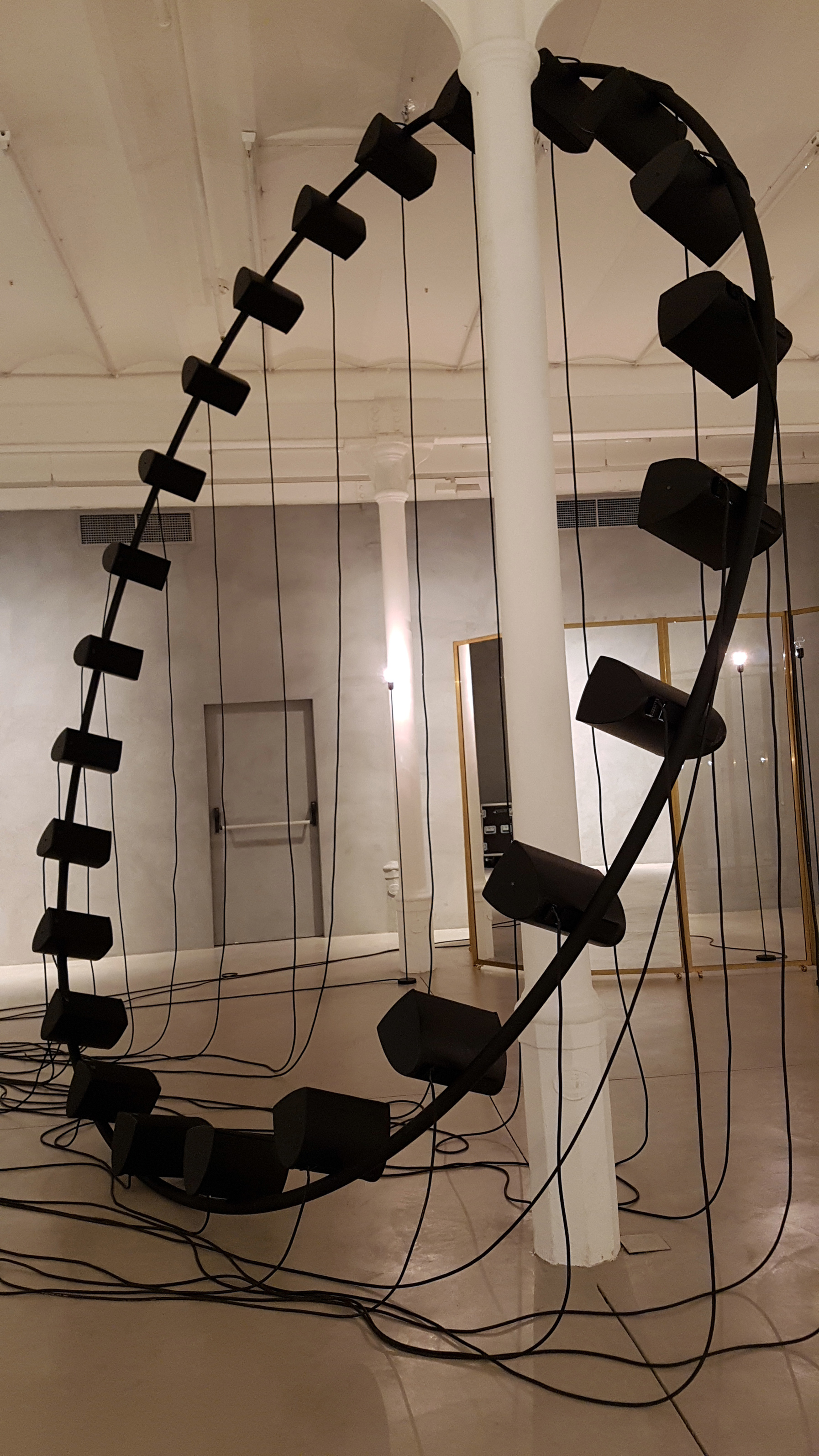 La segunda pieza de la muestra se ocupa de la percepción visual y auditiva del tiempo. La insistencia de la circularidad en la escultura sonora Clout-count (2018) no hace sino incidir en la idea de ciclo, un bucle obstinado donde no hay principio ni fin. Una repetición que queda marcada y amplificada por los sonidos rítmicos, reproducidos por 24 altavoces dispuestos en una gran circunferencia, como si de un reloj se tratara, señalando que estamos en constante y angustioso movimiento en círculo.