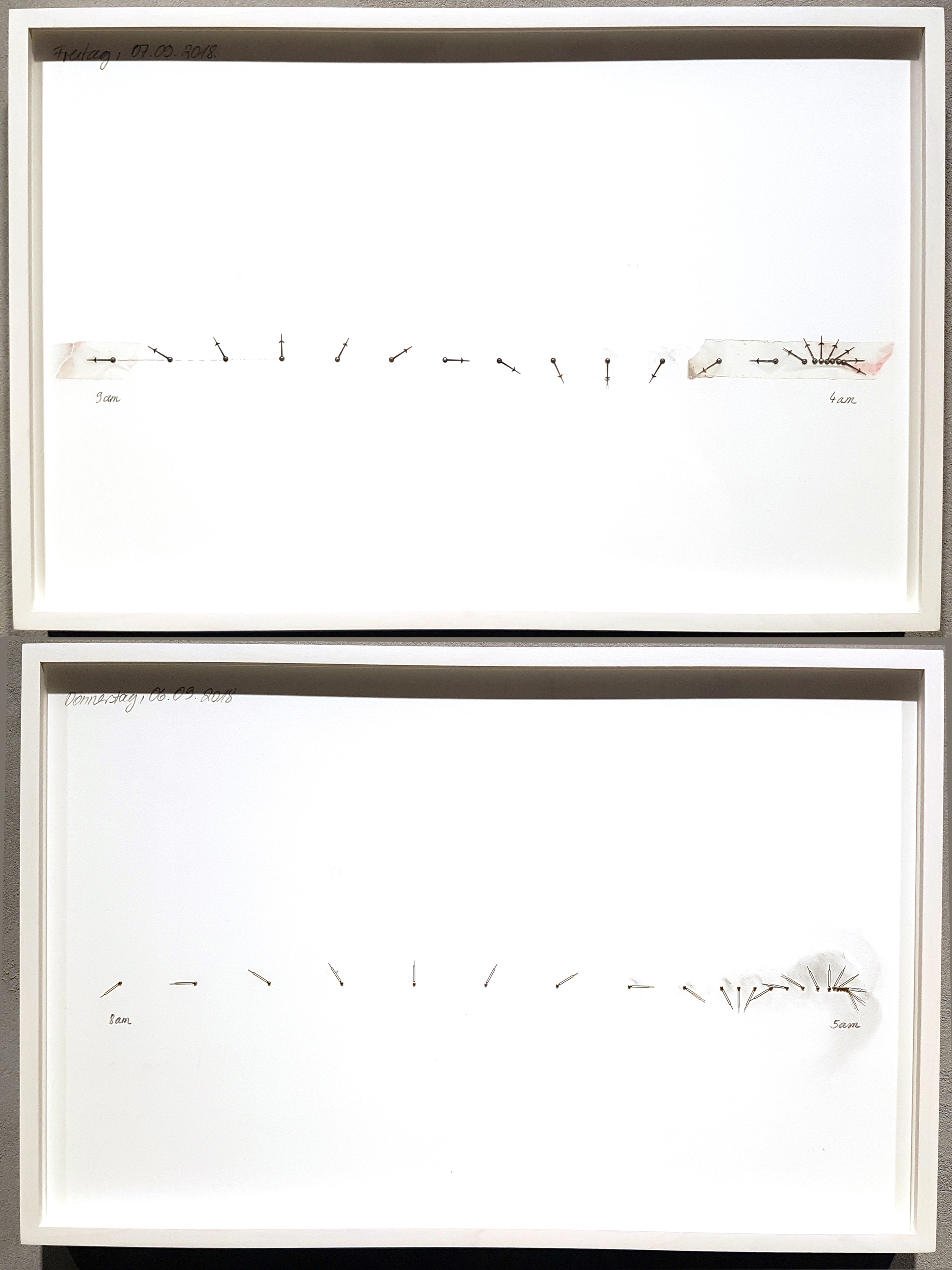 Esta sensación de estar atrapado en el tiempo cíclico y el espacio mentiroso y perturbador es el que la artista trata de registrar en In-Between; estos dibujos-collages donde concentra la experiencia vivida en un lapso de tiempo a través del movimiento de pequeñas agujas de reloj. Sin embargo, la naturaleza nos proporciona el ritmo cuyos intervalos son equilibrados pero no simétricos; se originan, así, variaciones con las que se crean nuevas musicalidades, cambios que favorecen otras miradas, otras combinaciones para generar nuevos órdenes.