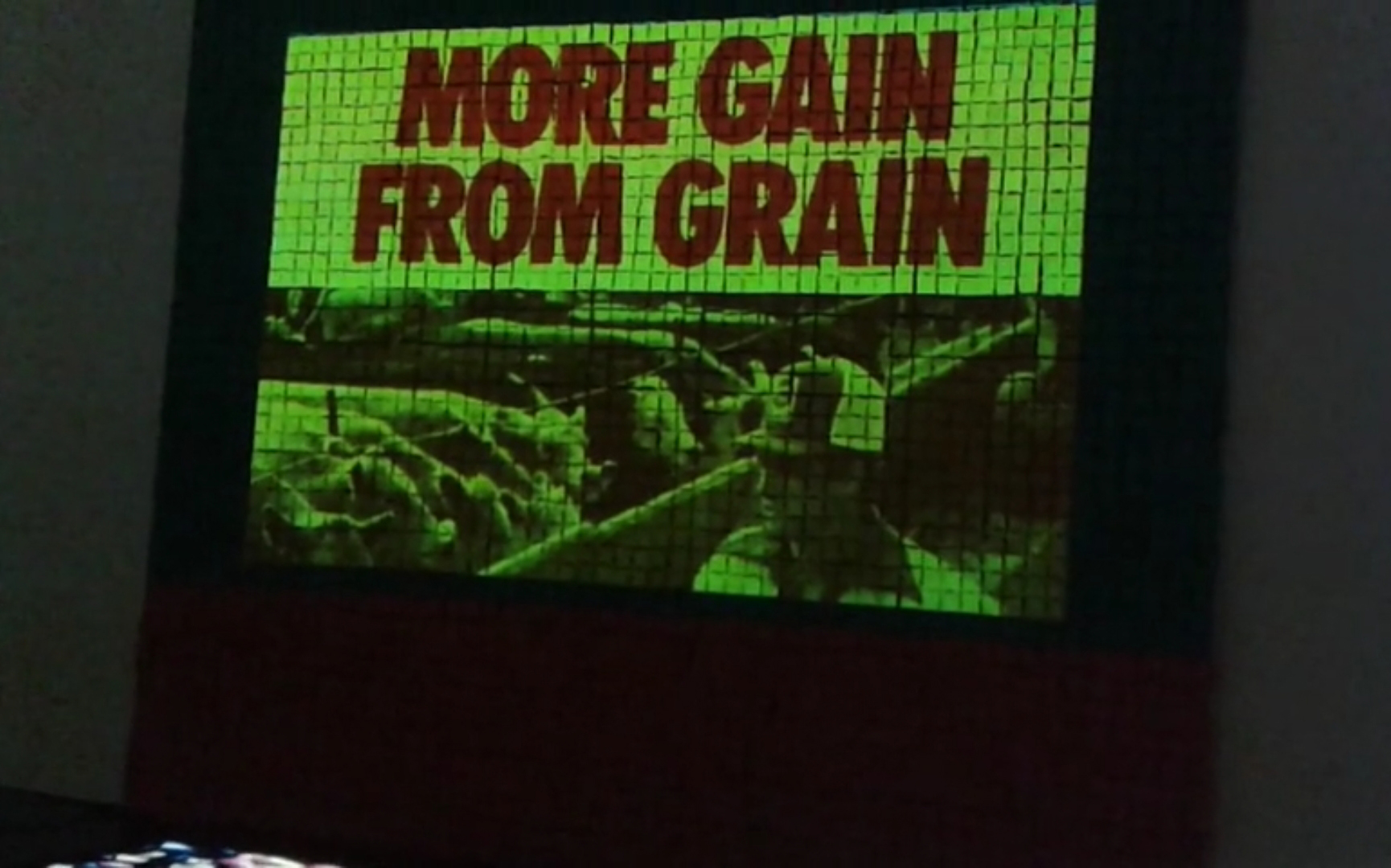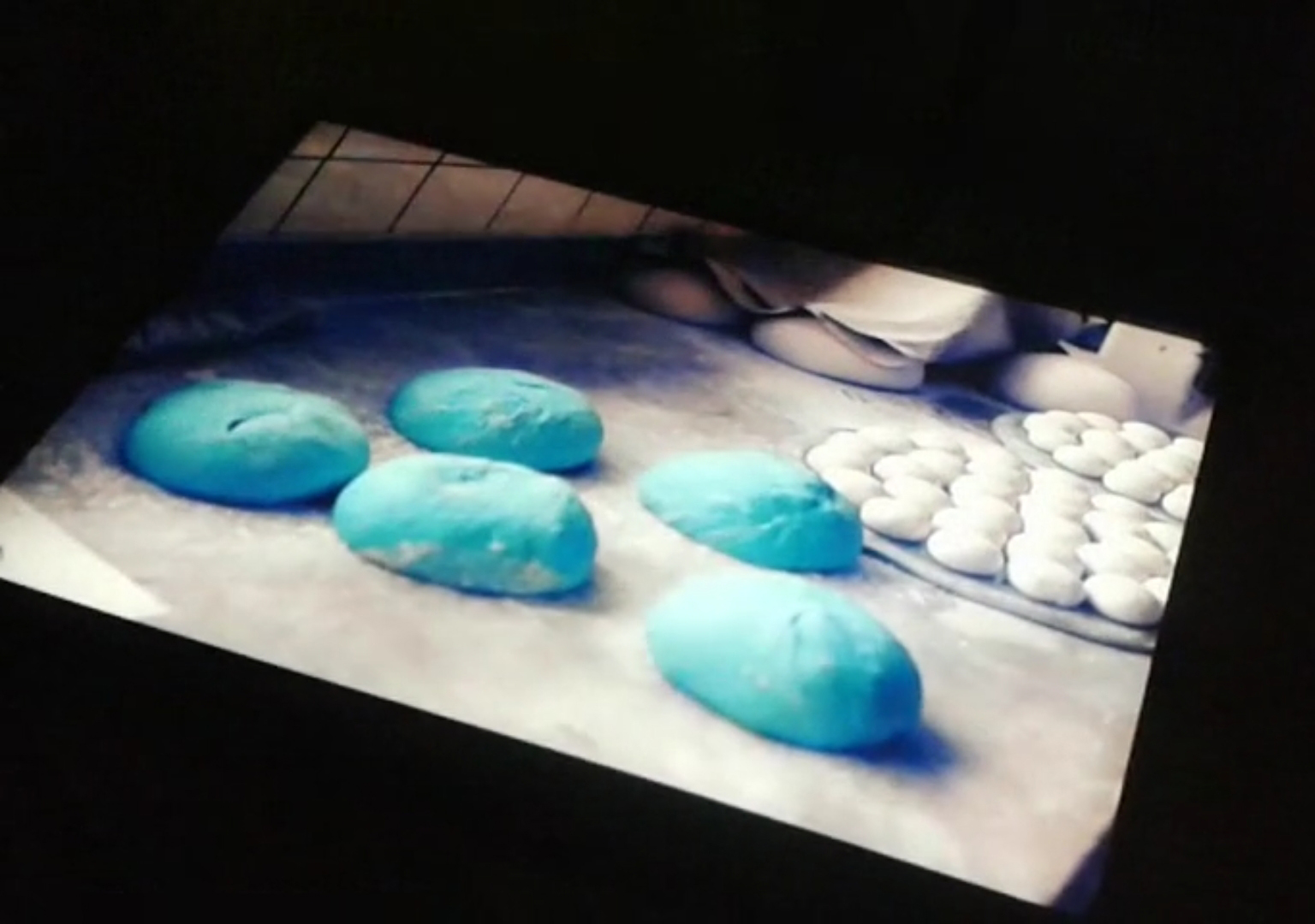 Concretamente, esta Instalación que se ilustra en el vídeo, la ceremonia Gold Taste, hace referencia a una subasta de grano. Se escucha la voz monótona y cansina del subastador mientras se proyectan, sobre un muro de pan, imágenes que relacionan el hambre, el comercio y el poder. Esta obra de 1981 continúa tristemente vigente y con más intensidad que nunca hoy día. Es vergonzoso e insultante ver la pasividad de los gobiernos ante el negocio que se hace sobre un derecho humano básico por parte de las multinacionales alimenticias.