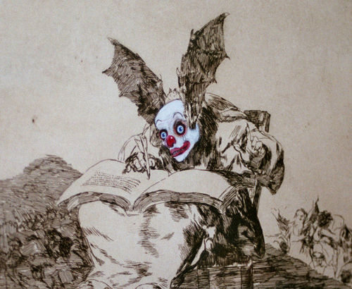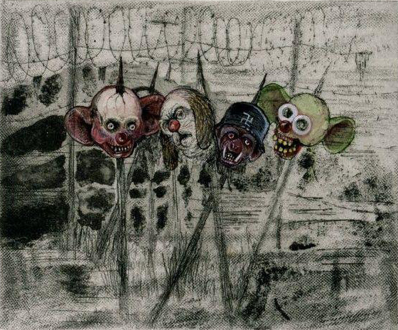 guerra, de su propiedad, caricaturizando y pintando máscaras de payaso con una clara intención provocativa. Esto es algo que va en su línea de trabajo ya que han realizado exposiciones donde incluso advierten antes de entrar, como si de un prospecto de un medicamento se tratara, que lo que van a presenciar puede ser ofensivo, provocar vómitos, confusión, pánico, euforia, ansiedad,… y previenen a los visitantes que sufren de los nervios o del corazón consulten a su médico.