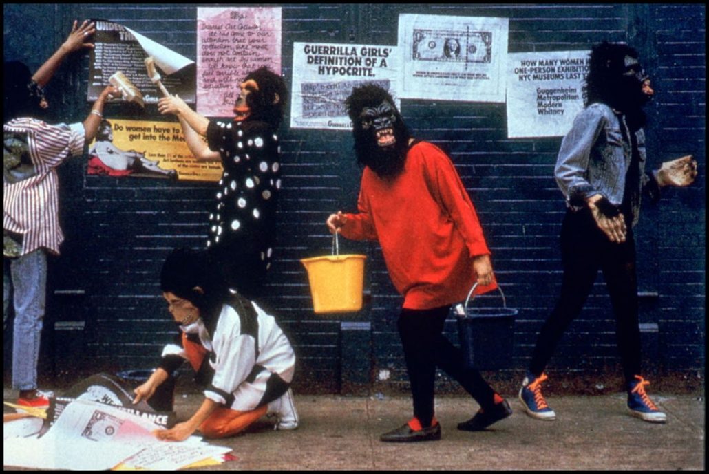 mujeres artistas en la esfera pública, el colectivo utiliza la exaltación de la máscara altamente agresiva como fórmula expresiva no tanto para sorprender como para sintetizar ideas complejas que tienen que ver con dejar muy claras ciertas posiciones. La imagen feroz del primate hace referencia a la célebre película de los años 30, King Kong: un monstruo gigante capaz de destruir la ciudad de Nueva York al que se le concede la sensibilidad necesaria para el “amor romántico” con la “chica de la película”. La máscara es representativa aquí de la masculinidad exacerbada y mal entendida de la sociedad patriarcal que todavía en los años 80 restringía el paso a las mujeres en el mundo de la institución museística a no ser que fuera como ideal de belleza y objeto cosificado para deleite del hombre. De esta forma se desenmascara el exceso de poder del género masculino que veta y oculta a las mujeres artistas enmascarando al propio arte y a la memoria que tenemos de él: un arte de sustrato violento, depredador y jerárquico, como las sociedades de primates, con las que estamos directamente emparentados pero nos ocultamos bajo el velo de la civilización y la modernidad. Una modernidad a pesar de las enormes discriminaciones y vejaciones a tantas etnias y colectivos minoritarios, además de las mujeres que somos la mitad de la población; Una civilización, la occidental capitalista neoliberal de 2018, que sigue siento racista, clasista y xenófoba, que cierra las puertas a los refugiados de las guerras que dota de armas y financia a gobiernos corruptos en África, Oriente Próximo y América Latina de los que obtiene grandes beneficios en contratos de reconstrucción después de las guerras.