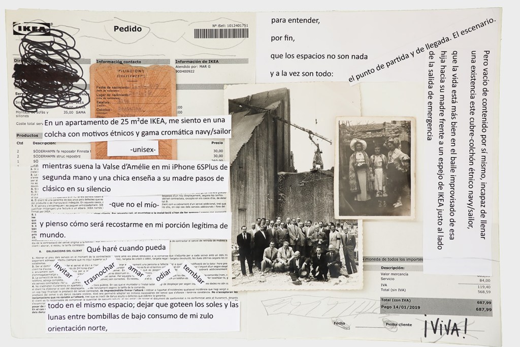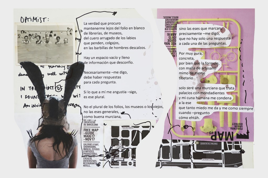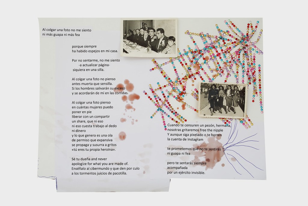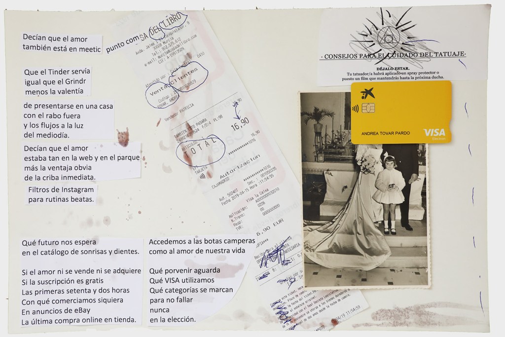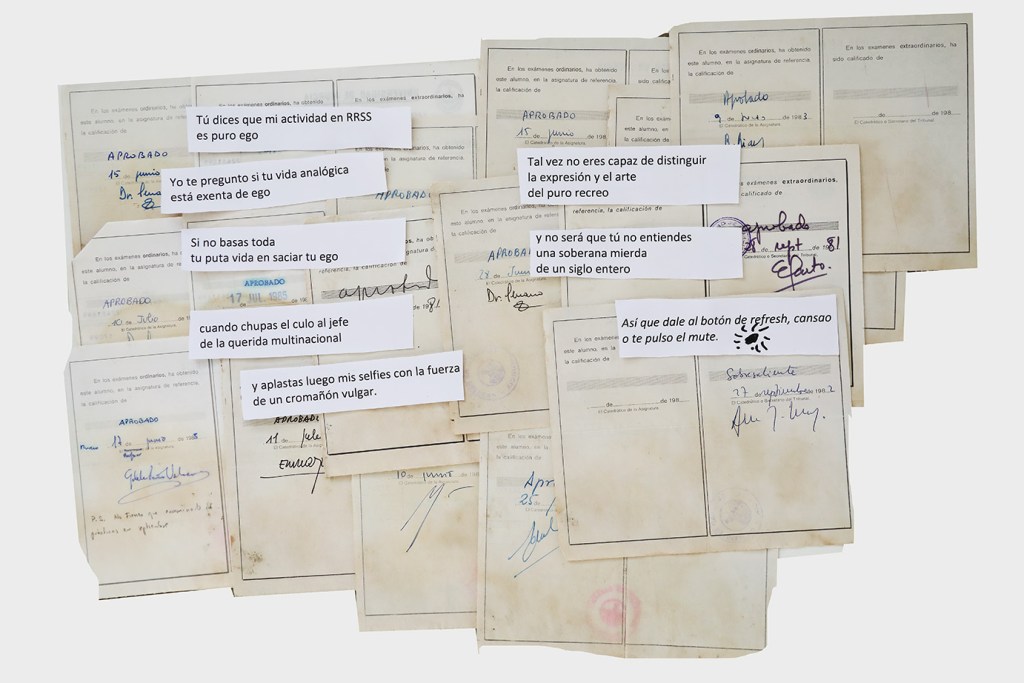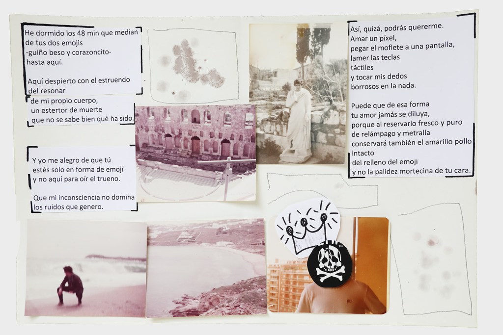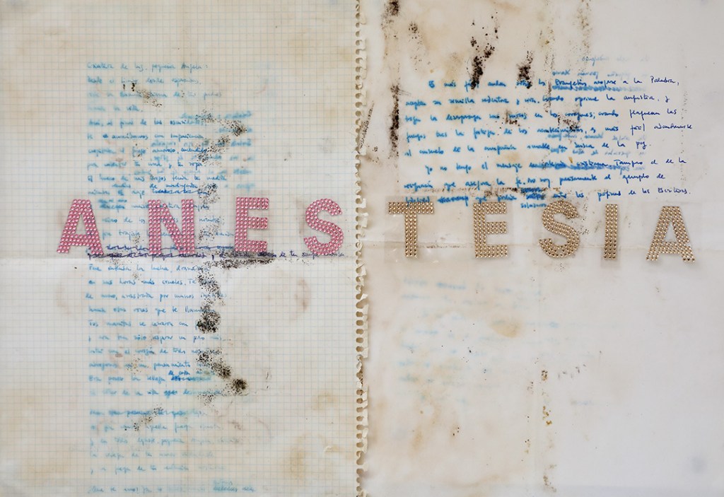 La anestesia, por tanto, no incide en la negación de lo sensible, sino en el colapso de los sentidos que obstruyen las vías de conexión en detrimento de la experiencia o la obtención del placer, y en última instancia de la supervivencia. Resulta contradictorio que, en este momento de auge de canales de información y redes sociales que nos conectan a través de mensajes de texto, de audio y de imágenes, el sistema sinestésico pueda revertir su funcionamiento y derivar en sistema anestésico como medida de prevención del cuerpo ante la saturación de estímulos que provocan el shock traumático. Walter Benjamin3 aconseja la distancia, para observar y sentir desde fuera la fantasmagoría capitalista. Sin embargo, Andrea Tovar recurre a la memoria fijada en el álbum de fotos familiar, las cartas y documentos del pasado para sus poesías visuales; mientras Manuel Granados se apropia de imágenes de la vida cotidiana colgadas en internet como construcción de un cuerpo virtual inconsciente. Ambos, se obligan a no caer en la “crisis de la percepción” que padecemos y se proponen registrarlo todo en sus piezas. Anotar en la memoria construye anclajes a los que volver y previene el adormecimiento. La memoria vela por la integridad perceptiva mientras se abren las vías para apreciar el tiempo contemporáneo y no sucumbir a la anestesia de lo estético. El peligro del individuo anestesiado reside en cómo queda despojado de su posicionamiento político e incapacitado para la crítica y la acción.