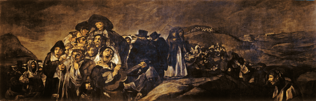 destinado a la habitación de las infantas, y el segundo pintado entre 1821-23 en La quinta del sordo. La romería luminosa y festiva realizada por encargo del rey Carlos III se vuelve oscura y siniestra. Como en el resto de pinturas negras, Goya representa rostros desesperados, seres anhelantes de gran patetismo afectados por el horror que ven y ejecutan ¿cantan o aúllan? ¿se divierten o sufren? Mas que un día de fiesta parece la travesía de exiliados que huyen de un escenario espantoso. Goya conoce la guerra de cerca, ha leído y escuchado sobre ella, ha visto sus consecuencias y puede imaginar vívidamente cómo el terror convierte a las personas en monstruos. Ha visto la denigración de las personas del pueblo por poderes que lo impregnan todo y corrompen hasta el aire. Aquí representa el interior más salvaje y abyecto del ser humano, ese que sólo se puede ver cuando se observa el interior de las personas que sufren las injusticias. Hay críticos que ven en uno de los rostros del grupo de cabeza el retrato de Napoleón (personaje que trae la promesa de acabar con las monarquías absolutistas y sin embargo sólo acarrea consigo el fantasma imperialista).