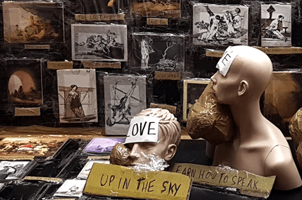 titulada Vitrina Mural (Goya). Un alegato que deja clara su posición política al exponer la instalación en una vitrina como si se tratara de un espacio etnológico de un Museo de Historia Natural, donde nos explica: este es el ser humano, el que lleva siendo al menos desde hace más de 200 años y que no ha cambiado, todo lo contrario, ha generado unos prototipos de individuos enfermos, modelos que se muestran en los maniquíes con un crecimiento tumoral exagerado y que etiqueta con la palabra love a modo de marca engañosa para el espectador o amor como única medicina que puede salvar la humanidad de la enfermedad que le produce el eterno conflicto. El amor es la palabra que los cristianos emplean cuando en realidad sería más correcto hablar de comunicación o comunión: la verdadera unión entre los contrarios para que dejaran de luchar y llegar a convertirse en los opuestos que se complementan en la paradoja y enriquecen mutuamente con sus diferencias, para llegar a crear una sociedad más sana y consciente.