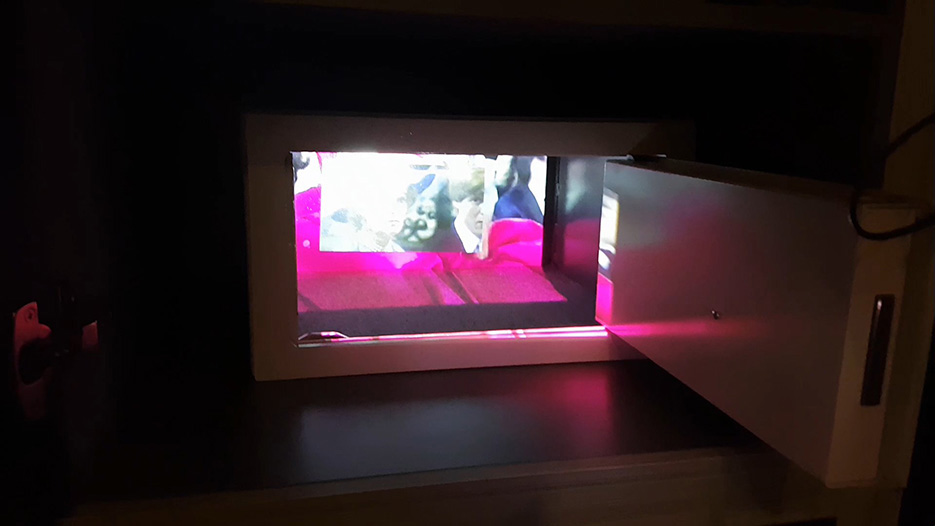 Esta instalación está integrada por la proyección de un videoarte en el interior de la caja fuerte de la habitación 211 del Hotel Petit Palace Santa Bárbara de Madrid. Acción realizada la noche del sábado 29 de Enero del año bisiesto 2019.