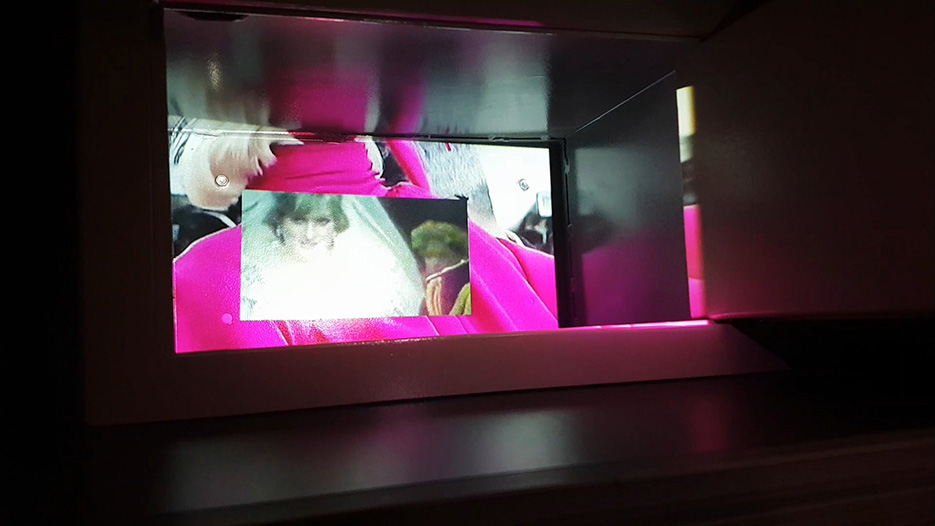El videoarte lo integra la superposición de dos imágenes: en primer término, en el rectángulo central se ven las imágenes de la boda de Lady Diana con el Príncipe Carlos de Inglaterra, la monarquía mas opulenta y ceremoniosa del mundo; en segundo plano, a pantalla completa, aparece una de las divas contemporáneas mas excéntrica, sobrecargada, incluso estrafalaria, Lady Gaga en la alfombra rosa de la Gala del MET 2019, luciendo un abrigo fucsia con una cola acarreada por cuatro porteadores con paraguas.