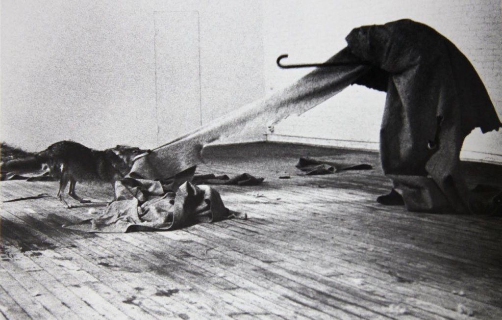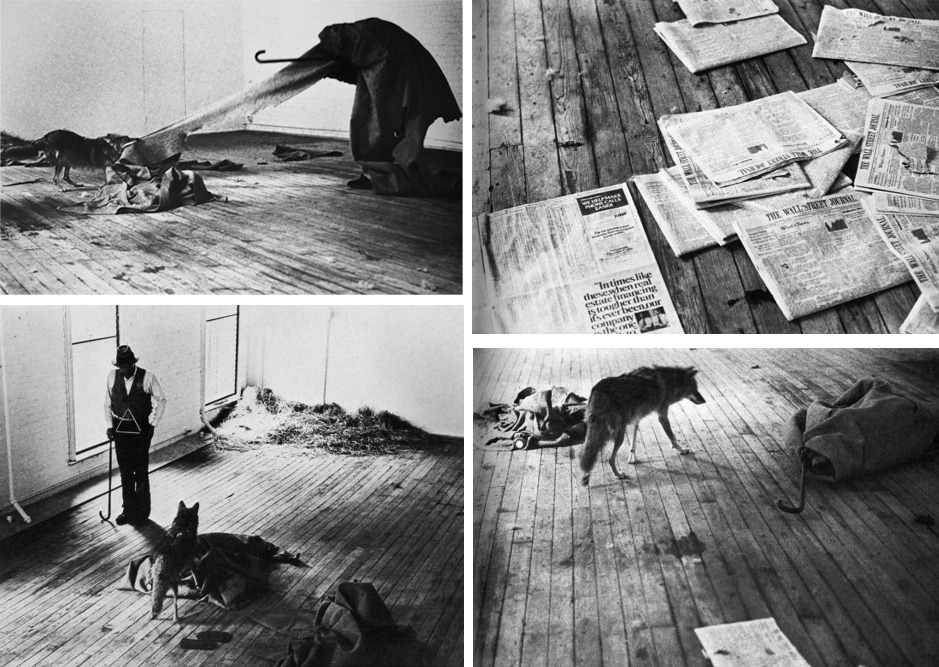 Esto es lo que mueve a Beuys a salir de su taller, donde pinta y esculpe, a realizar sus performances. En esta pieza, no sólo se aísla, encerrándose en una habitación con un coyote durante 3 días (como él mismo dijo para no ver nada más de EEUU que el animal), sino que la narrativa que emplea es mucho más sugerente. Podríamos estar hablando de una “historia” porque, desde mi punto de vista, hay una estructura programada, casi con planteamiento, nudo y desenlace, donde se relatan unos hechos que pretenden cuestionar las formas de relación entre los seres humanos y éstos con su entorno; aunque la diferencia con el teatro es notable, no sólo por la larga duración de la acción, sino porque interviene el azar: el comportamiento del coyote es impredecible y no existe guión a seguir. Merece la pena reseñar que Beuys no se desprende aquí de su faceta de profesor: incluye una parte didáctica, una enseñanza encubierta que reclama la reflexión.