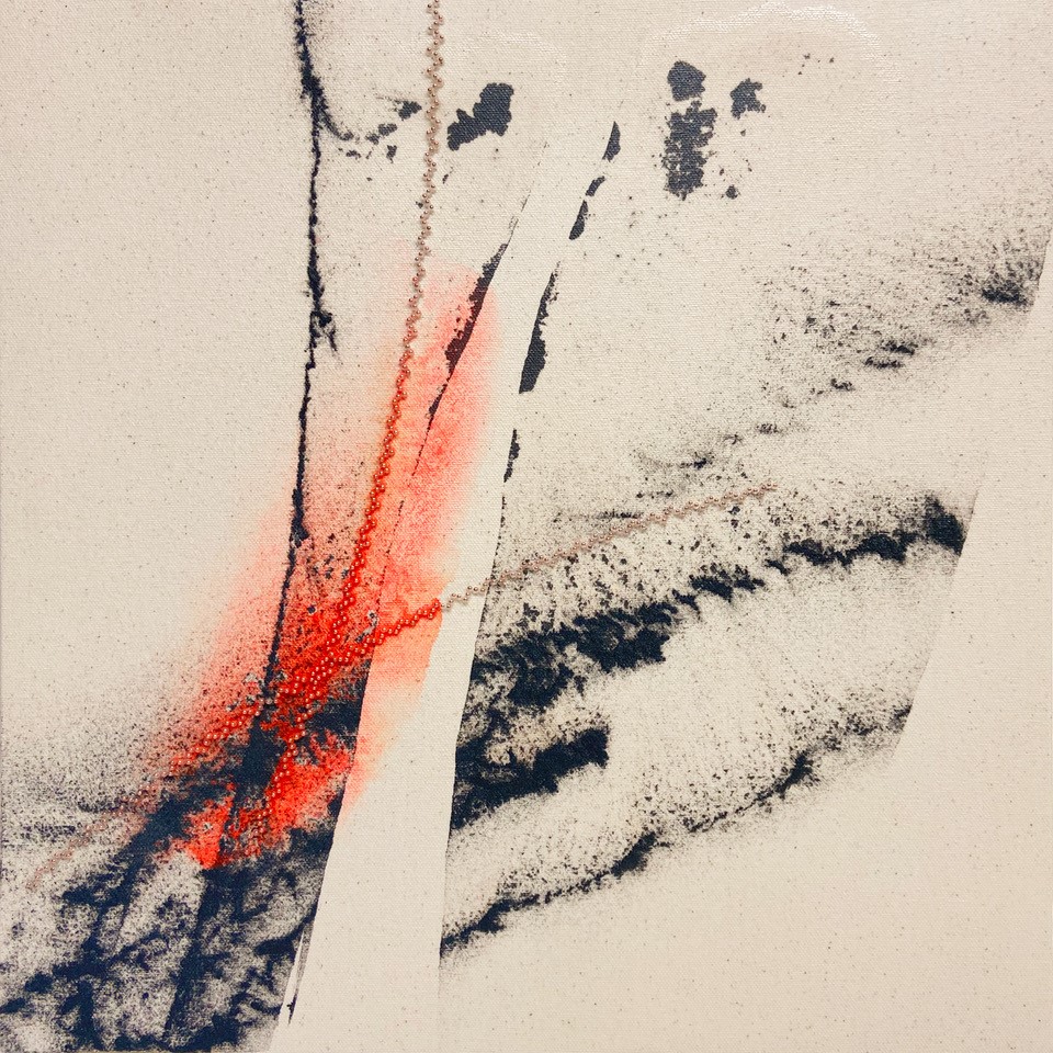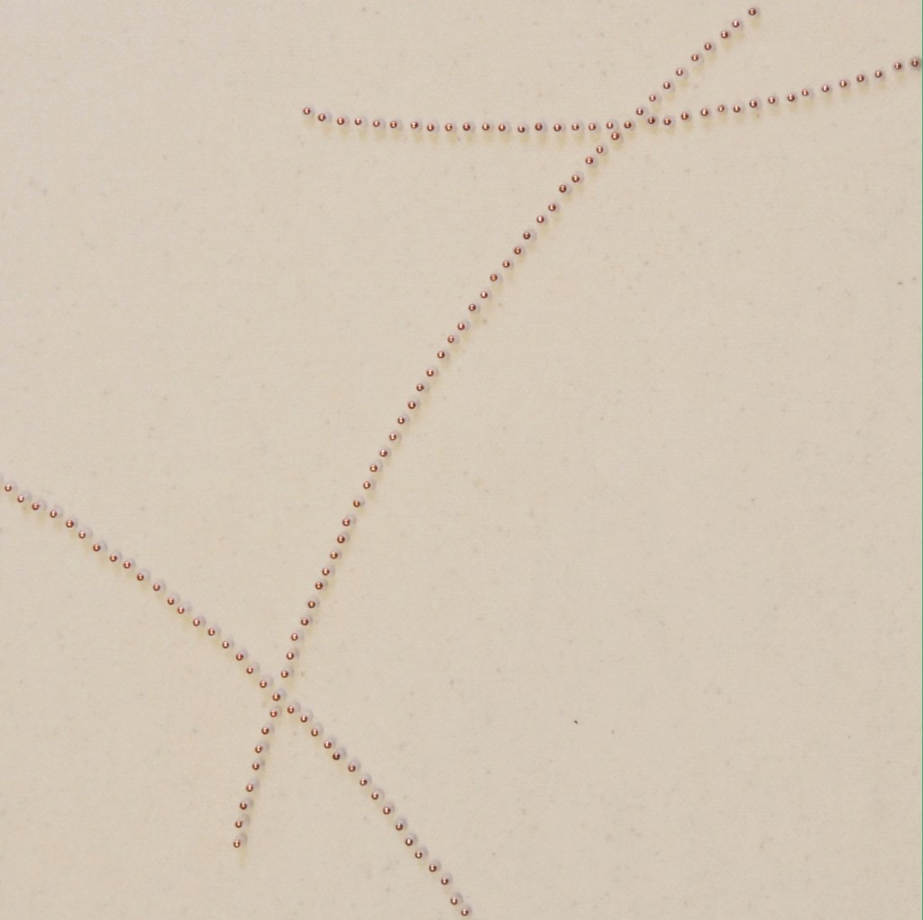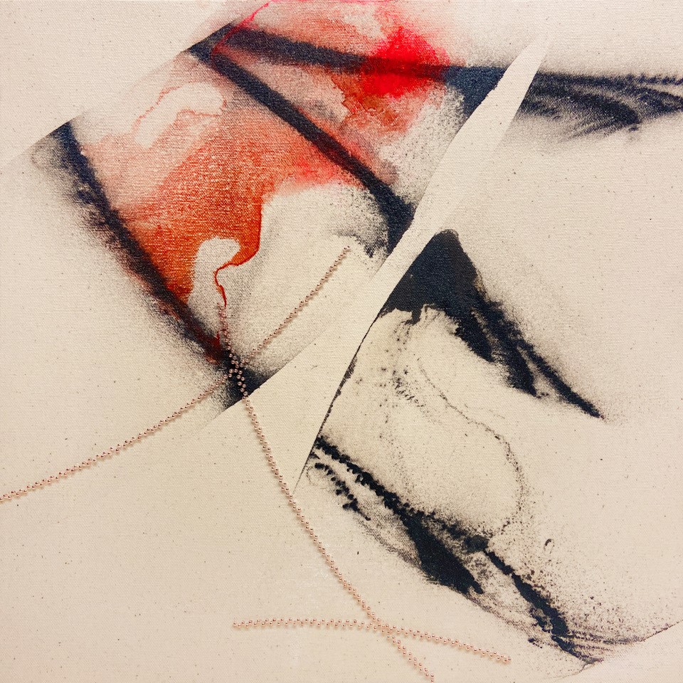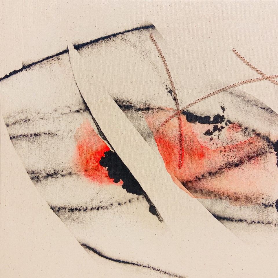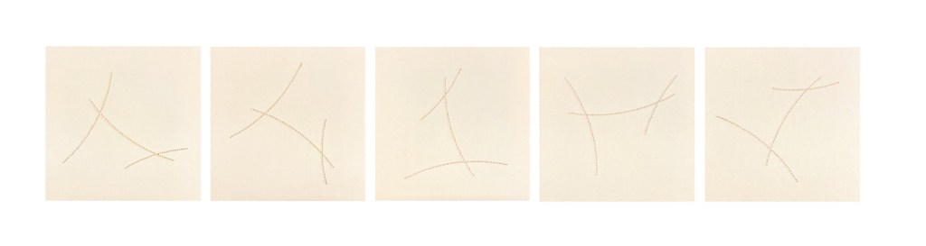 Esto ya queda patente desde la primera obra que abre la exposición: un políptico integrado por cinco cuadrados de lienzo en crudo forrado de papel gampi, un delicado material japonés, cuyas fibras hechas a mano se entretejen aportando una superficie satinada y de transparencia perfecta para ser atravesadas por las piezas metálicas que dibujan tres líneas curvas entrecruzadas, formando una especie de carácter ficticio de un lenguaje inventado. A pesar de disponerse de modo que asemejan suturas quirúrgicas impolutas, estas costuras no parecen unir ninguna grieta ni rotura y, sin embargo, perforan el soporte como si se tratara de una piel; se deja constancia así de cómo las cicatrices son rastros que demuestran que lo vivido es real y se incorpora en la memoria.