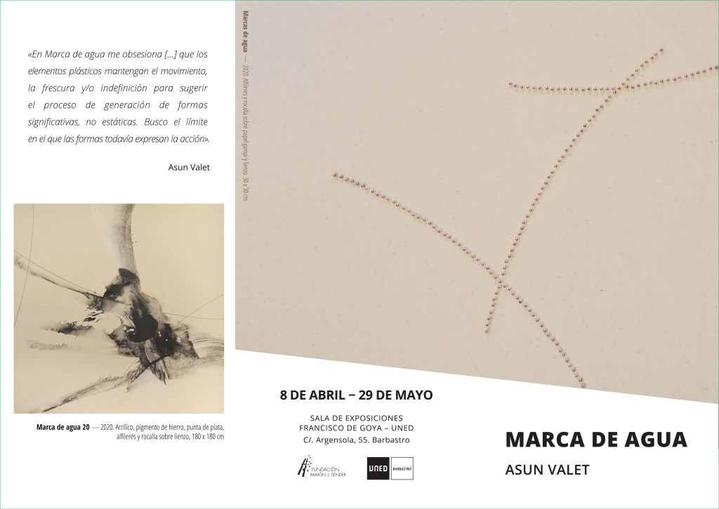 Asun Valet ha reunido en Marca de agua una serie de piezas fruto de una trayectoria madura y comprometida con la pintura. La experiencia no sólo le ha servido para alcanzar una precisión y destreza plástica visible para todo aquel que mira sus obras, sino que durante este recorrido, basado en una seria investigación de materiales y formas, ha ido definiendo conceptos que ponen el foco en dos cuestiones fundamentales: de un lado, la intervención presencial en el acto de reparar, es decir, facilitar la convivencia entre aquello que se da la espalda, entre lo que parece que no se corresponde; y por otra parte, el intento de hacer visible que somos devenir, transformación y cambio.