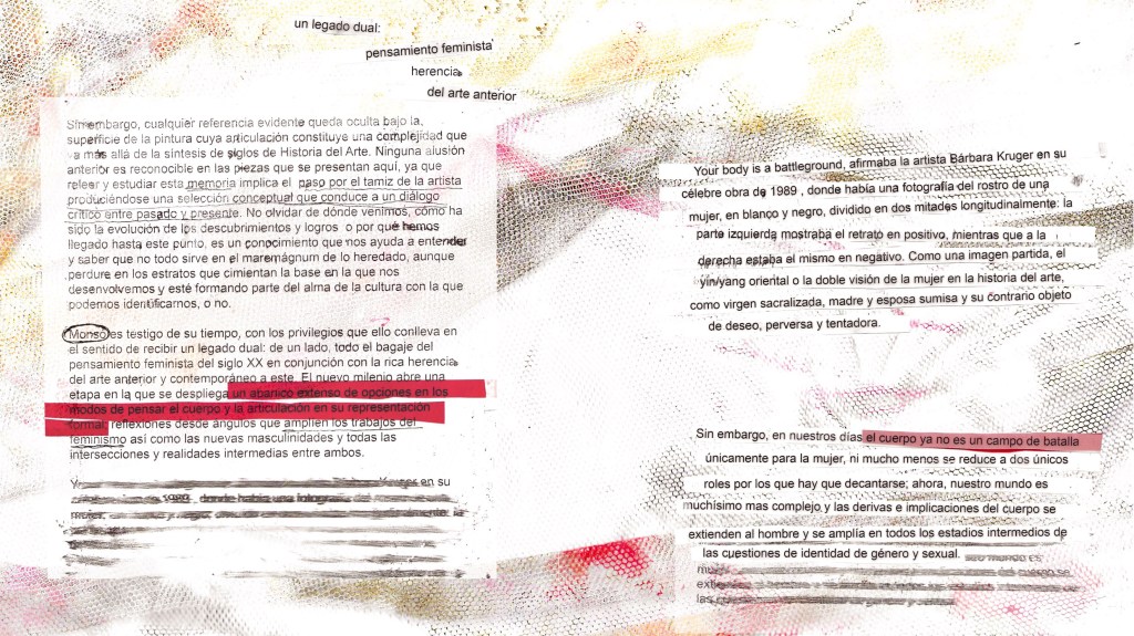 “Your body is a battleground”, afirmaba la artista Bárbara Kruger en su célebre obra de 1989, donde una fotografía del rostro de una mujer en blanco y negro se dividía en dos mitades longitudinalmente: la parte izquierda mostraba el retrato en positivo, a la derecha en negativo. Como una imagen partida, el yin/yang oriental o la doble visión de la mujer en la Historia del Arte, sea como virgen sacralizada, madre y esposa sumisa, sea como su contrario en objeto de deseo, perversa y tentadora.