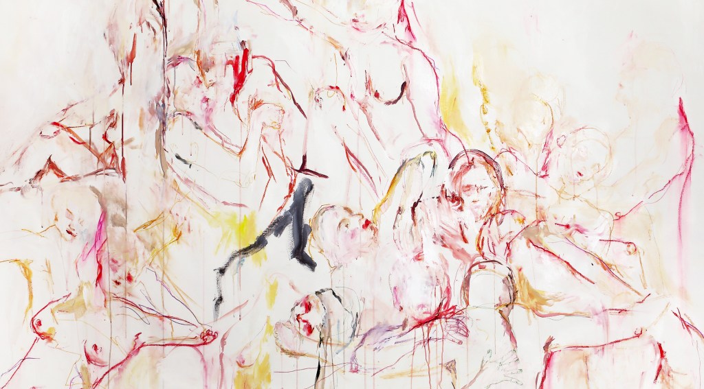 Volver la mirada a la memoria heredada es, para Ana Monsó, el impulso primero que le reactiva. Cualquiera de los cuadros de grandes artistas como Goya o Leonardo da Vinci, obras como La Virgen (o Las Vírgenes) de Gustav Klimt o los autorretratos de Egon Schiele, son el punto de partida: ese clic o punzada (Roland Barthes1) que se siente cuando una obra de Arte —o parte de ella— te llega y atrapa de un modo inexplicable. Barthes lo describe como una herida, porque solo lo innombrable es lo que verdaderamente trastorna y produce inquietud, incluso malestar. A partir de ese instante fulgurante en que quedamos marcados, se despliega una «fuerza expansiva» de la que un artista no puede escapar. Eso le impulsa a actuar. Así, pintar es el modo de convertir el impulso en experiencia. El lienzo resultante es la expresión misma del sentimiento, por fin visible para todos.