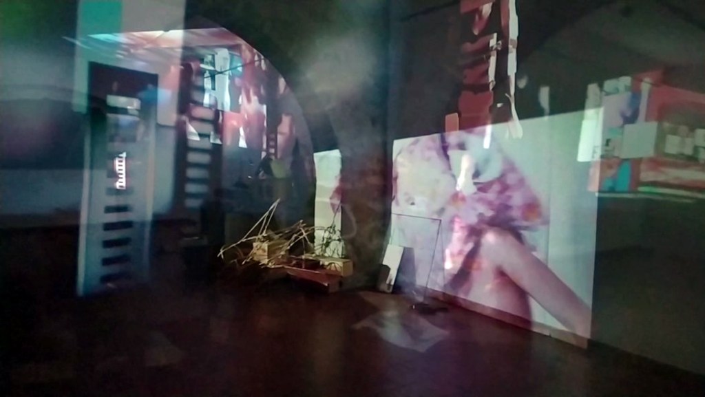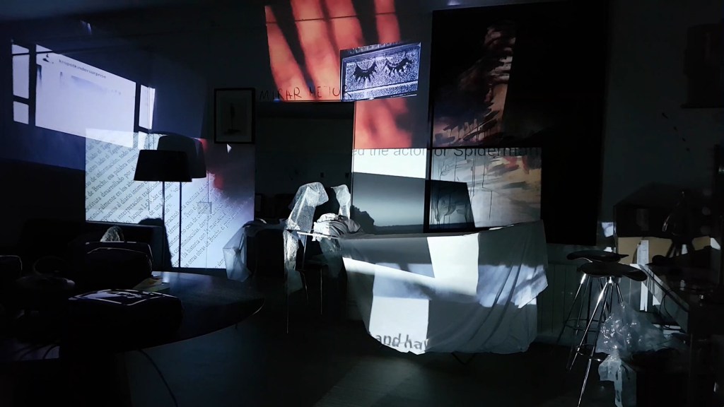 En esta instalación inmersiva se reclama la interacción del espectador al poner en relación el cuerpo físico y el cuerpo virtual. El primero, lo integran el mismo espacio y los objetos que lo ocupan; estos son la casa desmantelada donde se ha perdido toda conexión y funcionalidad originaria. El espacio y los enseres incorporan la memoria congelada que se comporta como pantalla receptora; al proyectar el cuerpo virtual de los videos sobre su relieve y mobiliario se altera la información contenida en la memoria de las imágenes, para adquirir nuevas significaciones: cada idea, texto, noticia, foto o gif, que se sube al cuerpo virtual, se identifica con un estado de conciencia que articula una dimensión o ámbito.