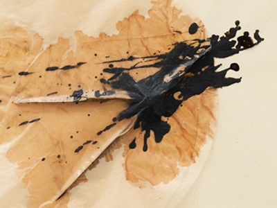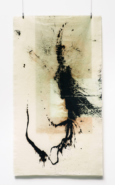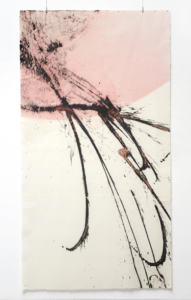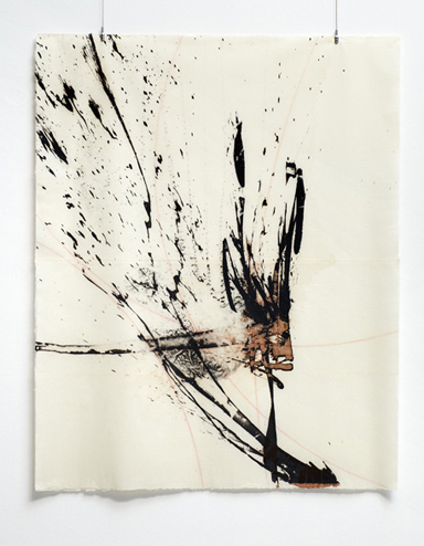 La hoja de papel del primer plano, tan liviana como la secundaria, sirve de soporte a la pintura acrílica a base de oscuros y pesados pigmentos de hierro, desplegándose en amplios y vibrantes trazos cuya expresión muestra la tensión del signo que nace de lo más profundo, pero se realiza fuera, en un movimiento que reclama el espacio agrandándose. El gesto puede interpretarse como algo negativo, algo que hace referencia a una condición humana de rebelión, pero también puede ser una proyección del inconsciente, una necesidad o liberación por desbordamiento.