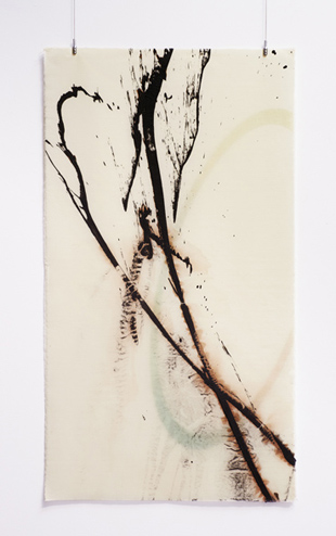 Al mezclarse con el agua, el pigmento de hierro se comporta de diferentes modos. El agua agrieta la pintura formando pequeños canales de evacuación y actúa como catalizador de la oxidación, permitiendo que adquiriera tonalidades marrones o rojizos; dependiendo de las concentraciones y el tiempo de exposición al agua, el hierro puede endurecerse generando ásperas texturas o diluirse dejando un rastro desdibujado. En cualquier caso, su evidente presencia provoca un diálogo de fuerzas entre la resistencia de las fibras entrecruzadas del delicado papel japonés del soporte y la frágil solidez del hierro. Valet consigue que todas las cualidades de los materiales y sus relaciones de oposición queden representadas en el juego de apariencias, visibilidades y veladuras, creando un equilibrio invisible.