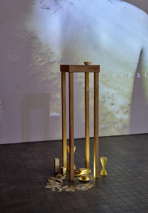 No se puede dejar pasar el análisis de la parte escultórica de la videoinstalación, una estructura estucada que se encuentra a medio camino entre una mesa y un pedestal; se trata de una pequeña plataforma cuadrada horizontal sustentada en cuatro patas absurdamente altas para una mesa, inconvenientemente frágil para soportar un monumento. Por lo que, tanto la función de mesa como la de pedestal quedan anuladas, la estructura no cumple ninguno de estos cometidos. La suspensión del propósito inicial, ya que la palabra mesa aparece en el título, nos remite a Kant, y a su definición de arte como finalidad sin fin, es decir, el filósofo defiende que la pieza artística no se identifique con ningún condicionante externo más que el que ella misma propone33. Y en la instalación de Rosa Gimeno, la estructura principal o no mesa sirve de cobijo a un conjunto de objetos que se distribuyen en el suelo de manera aparentemente azarosa; hay un libro de páginas rígidas, una taza rellena de escayola, un teléfono móvil antiguo, unas estructuras de madera a modo de diábolo y un conjunto de fotografías (sacadas del audiovisual anterior) que se despliegan formando una espiral abierta.