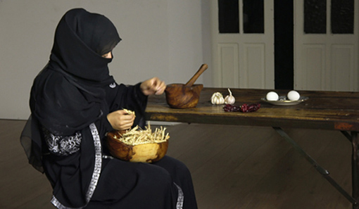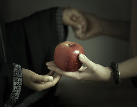 Entre las viandas de la mesa hay guindillas, pero a diferencia del contexto del autor del Siglo de oro, aquí no es un signo de riqueza económica, sino símbolo de procedencia oriental, como Manizha. Las guindillas nos remiten a las antiguas rutas comerciales de gran intercambio cultural y a la necesidad de fomentar el diálogo para iniciar una transferencia de fuerzas que posibiliten los derechos de todas las mujeres excluidas, maltratadas y recluidas a una vida de sufrimiento simplemente por ser mujeres; esta acción o intersección cultural culmina en el final de la pieza, cuando se quita el velo y a continuación una mujer occidental sale de la habitación para ofrecerle la manzana de Eva a Manizha. Una entrega que tiende la mano en actitud de amor y hospitalidad, para dar apoyo, cobijo y seguridad. Comer de la manzana de Eva32 supone, de alguna manera, la insumisión hacia todo lo que coarte el conocimiento, la tolerancia y la armonía de las mujeres y por extensión de toda la sociedad.