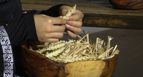 Y sin embargo, Jesús se acerca a las mujeres en cualquier circunstancia; valora en ellas su capacidad de escuchar y aprender, alaba su hospitalidad y el trabajo del cuidado del otro. Y en esa línea, la artista erige a la mujer como pilar central imprescindible en cualquier cultura o sociedad rescatando del olvido a mujeres de otras etnias y culturas orientales. Tal es el caso de los videoarte Me llamo Diana y Soy Manizha. En este último, Gimeno hace su particular homenaje al cuadro de Velázquez titulado Cristo en casa de Marta y María31, para contarnos la dura vida de Manizha, refugiada afgana de un régimen socio-político y religioso fundamentalista. Ella representa a tantas mujeres de su país sin ningún derecho y, sin embargo, son el eje fundamental de la familia, de la guarda y manutención de los hijos, hermanos y ancianos, sin apoyo ni recursos. La composición está cargada de simbolismo: en el centro de la imagen, privilegiando el relato de crueldad bajo el velo, se coloca la joven que, mientras cuenta su historia a modo de oración, va desgranando las espigas de trigo, aludiendo a la tarea de alimentar a la familia que, tradicionalmente, recae en la mujer. En segundo plano, en un claro guiño a la ventana de Veláquez, se abre un vano a otra estancia donde se desarrolla cierta actividad invisible al espectador solo apreciable por las sombras que se reflejan sutilmente.