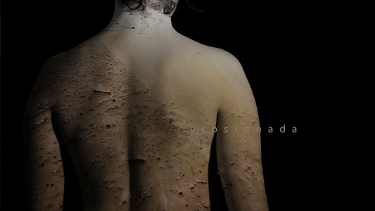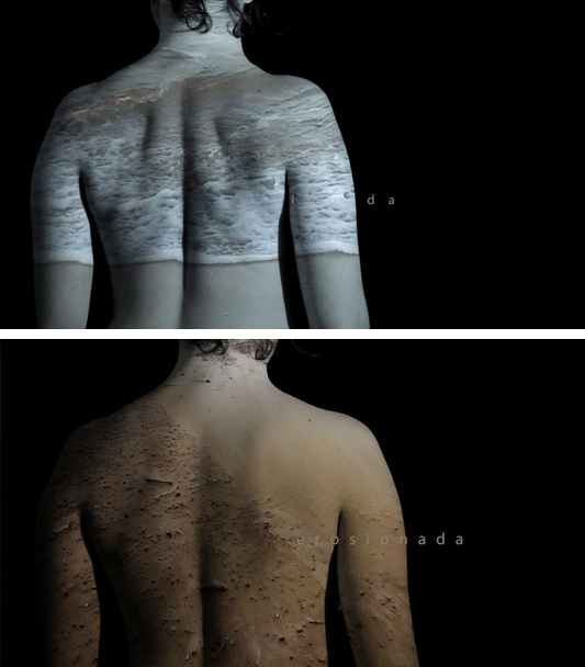 Continuando con la lectura de esta obra, inmediatamente, la artista nos muestra su verdadero interés. Sobre la piel proyecta imágenes de abstracciones de territorios y lugares intercaladas con las palabras ocultada, erosionada y contaminada. La composición simula cicatrices y huellas de maltrato, lo que nos dirige por analogía a cómo el cuerpo de la mujer ha sido terreno libre para la injusticias de convenciones sociales y culturales. Aparecen fotogramas de un desierto que al combinarse con la palabra erosionada, alude a las mutilaciones y escarificaciones25 que todavía hoy se realizan a tantas mujeres para cumplir cánones de belleza cultural. Por último, la espalda con la proyección del mar unido a la palabra líquida, mantiene una ambigüedad interpretativa, entre la disolución de una forma impuesta o la emersión transformada en una misma.