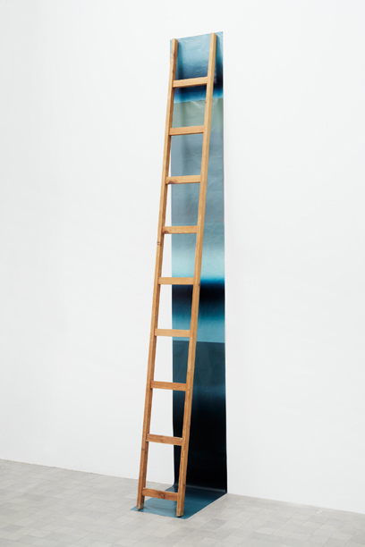 Sensaciones muy distintas ofrece la pieza Infinitud, donde la pintura se comprime en una estrecha franja de papel que recorre la pared verticalmente hasta el suelo, para continuar extendiéndose en horizontal. La formación en ángulo recto se cierra en un triángulo con una sencilla escalera de madera. La pintura, en degradados de color azul grisáceo, parece describir cielos consecutivos con varios horizontes ficticios, inexistentes pero visibles. Las sugerencias de esta obra se multiplican; por un lado, queda implícita la confusión de la percepción entre los ámbitos de lo sensible y lo intelectual, imposibilidad visual o abstracción matemática; y sin embargo, la escalera está invitando a subir y dilucidar qué se esconde más allá del límite de lo perceptible. La escalera interfiere y da posibilidad de conocimiento. Simbólicamente, el triángulo formado por la unión de objeto y pintura hace referencia a lo sagrado; además, la escalera por sí misma, es la metáfora de la unión con un mundo que no vemos, el mundo de los conceptos místicos y los misterios del alma.