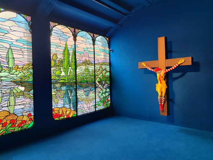 La pieza “McJesus” del artista Jani Leinonen encarna como ninguna la complejidad de todo el entramado de intereses que se cruzan y confunden en una maraña que llega a ser ridícula mirada en su conjunto. Hay crítica contra multinacionales alimentarias, política local e internacional, conflictos religiosos y protestas sociales en una sola obra, en la que se representa al icónico payaso de McDonald en la cruz. Esta pieza formaba parte de la colección del Museo de la ciudad de Haifa, Israel; las protestas de la comunidad cristiana de la ciudad alertaron al propio artista de esta exposición sin su consentimiento, quien pidió la retirada de la obra, porque apoya el movimiento de sanciones y boicot al Estado de Israel.