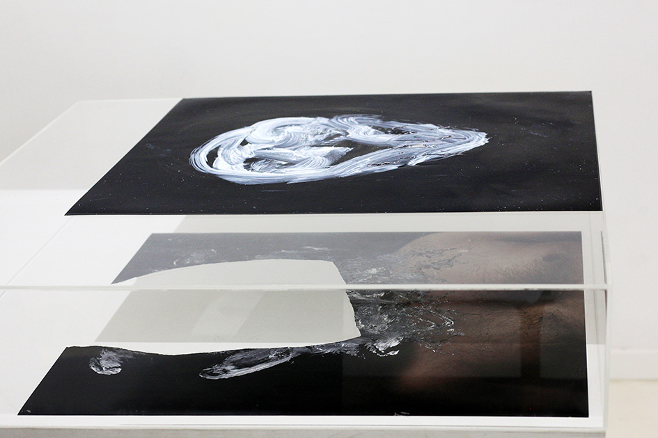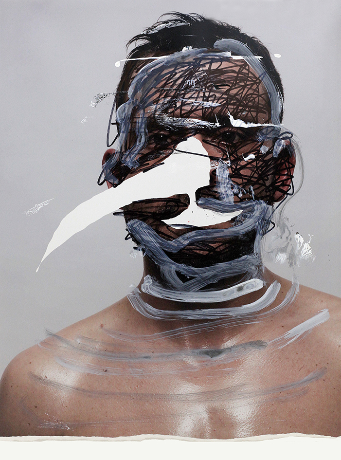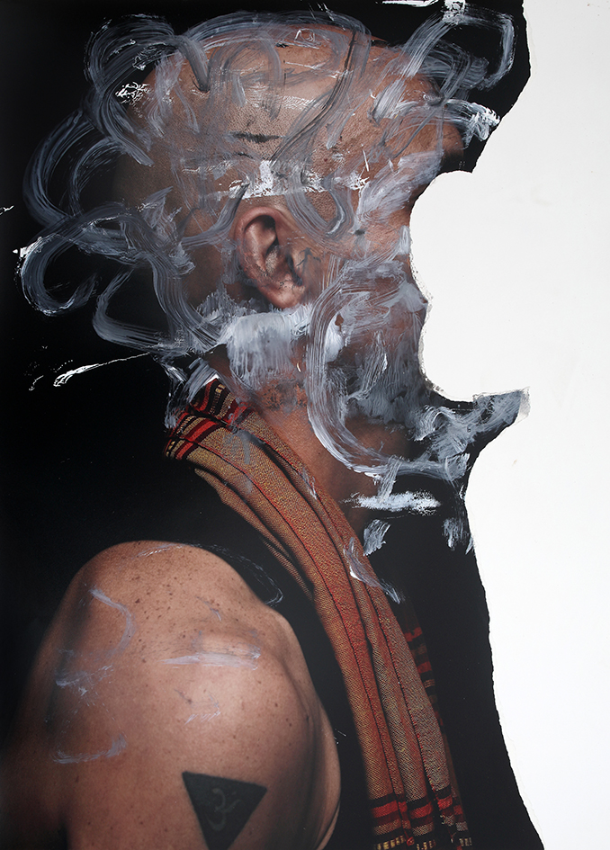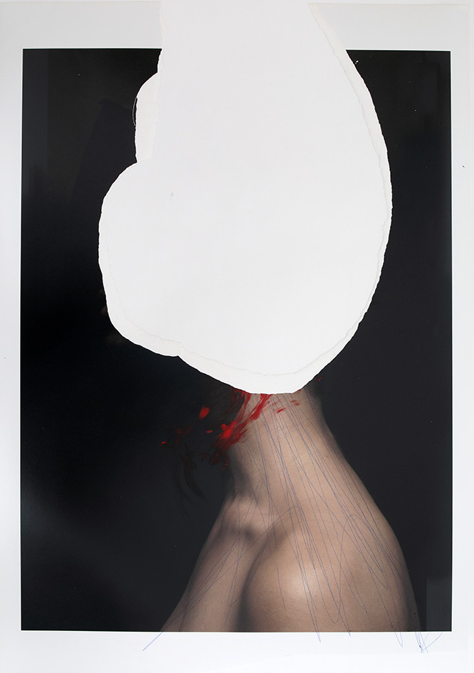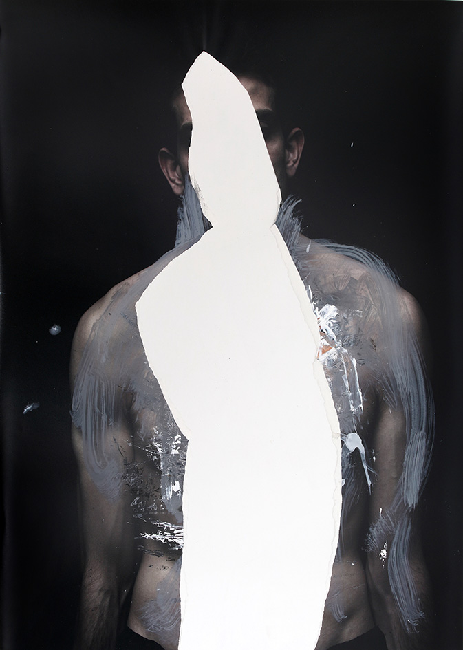 En series como “Cuerpo y peso” y “Retratos con vacío necesario”, el artista interviene las superficies fotográficas con gestos pictóricos que incluyen rasgaduras, manchas, sobreimpresiones y superposiciones, rupturas formales que operan como una metáfora visual del proceso de iluminación. Al desdibujar los contornos de lo real, las composiciones evocan una dimensión espiritual que interroga las estructuras tradicionales del poder. Este enfoque dialoga con las reflexiones de Walter Benjamin sobre el «aura» artística, subvirtiendo las dinámicas de dominación que caracterizan el uso contemporáneo de la imagen. Estas técnicas no solo violentan la representación bidimensional, sino que instauran una materialidad disruptiva que redefine el significado del cuerpo representado.