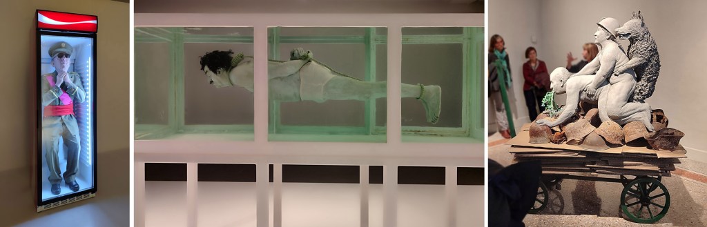 Entre las obras políticas que exhibe el museo se puede ver La pieza “Shark” de David Cerný, que muestra una representación muy realista de Saddam Husein, muerto y humillado dentro de una pecera, haciendo clara alusión al tiburón de Damien Hirst que tantas polémicas ha provocado. Esta pieza fue eliminada de la exposición realizada en una ciudad belga en 2006 para no ofender a la comunidad musulmana (eran recientes las manifestaciones por la caricatura de Mahoma publicada en el periódico danés Jyllands-Posten, acompañando precisamente un artículo que trataba la autocensura, la libertad de expresión y el miedo que tienen muchos autores a las represalias). La obra de Merino, “Always Franco”, levantó a la Fundación Francisco Franco exigiendo su retirada de ARCO 2012, por atentar contra su honor. Aún sigue generando reacciones en redes igual que el dibujo de Donald Trump desnudo y con su típica expresión de burla, de escaso valor artístico, pero es un ejemplo muy relevante por el hecho de ser censurada la artista, Illma Gore, no solo a exponer la pieza en EEUU, sino en Facebook ante el aluvión de protestas y amenazas de muerte que recibió; y, sin embargo, su valor en el mercado en 2016 fue alrededor de 1,3 millones de euros (aunque no he podido saber cuál fue el precio que pagó el museo por esta pieza y el video en 3D que la acompaña).