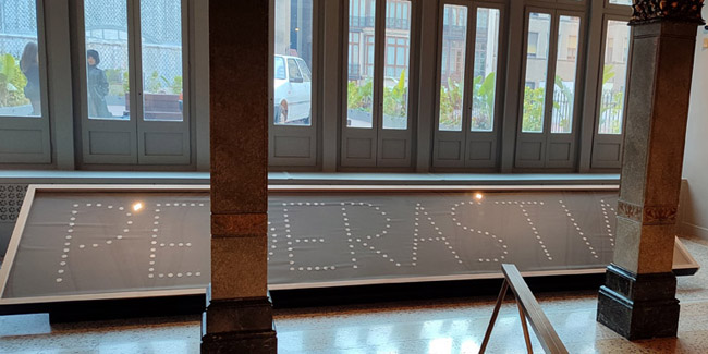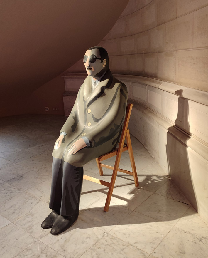 Y precisamente, el museo comienza en el mismo rellano de entrada a la modernista Casa Garriga Nogués con una escultura en cartón piedra titulada “Espectador de espectadores” de Equipo Crónica. Se trata de un agente de la policía secreta franquista superviviente de los 100 ejemplares que se distribuyeron como público en un concierto que formaba parte del festival de arte de vanguardia “Los Encuentros” en 1972, en Pamplona. La mayoría fueron golpeados, vandalizados e incluso robados. Esta figura sedente, es una imagen sencilla y humilde pero con una gran carga simbólica. A pesar de representar un hombre anodino, encarna todo el poder de la represión de un sistema autoritario, sentado como un faraón o un cristo entronizado, vigila y controla a los jóvenes que se sublevan contra el símbolo.