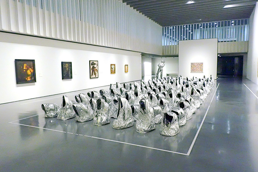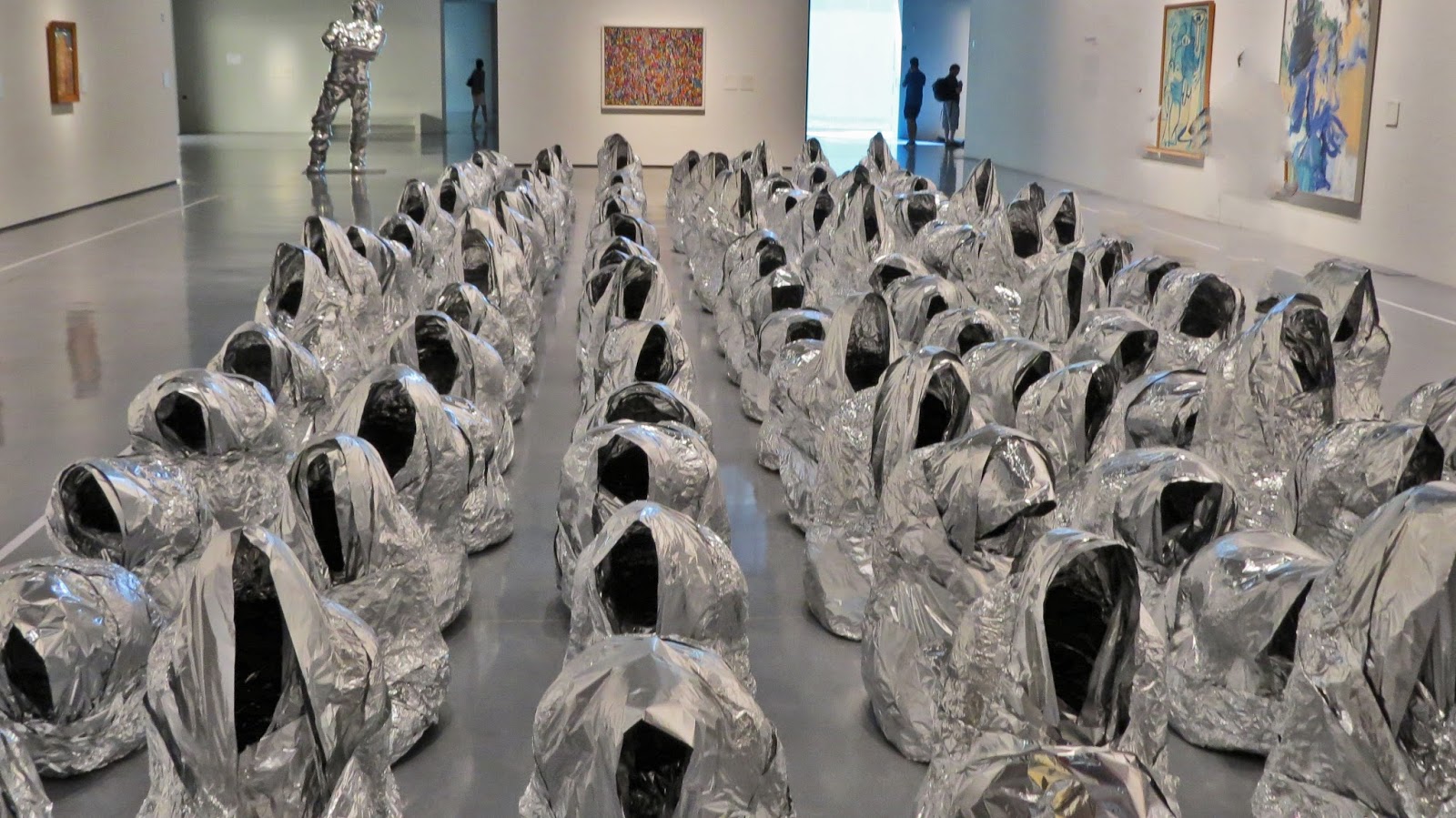 Instalación de 112 esculturas a tamaño natural moldeadas con papel de aluminio, a partir de alumnas de Bellas Artes, arrodilladas en posición de oración, orientadas en la misma dirección y perfectamente alineadas en 7 columnas de 16 filas. Todas las esculturas están huecas.