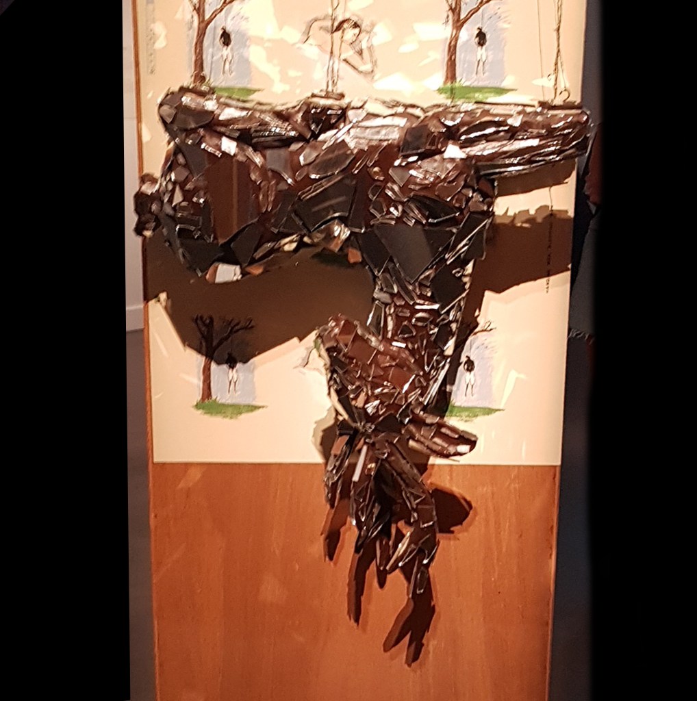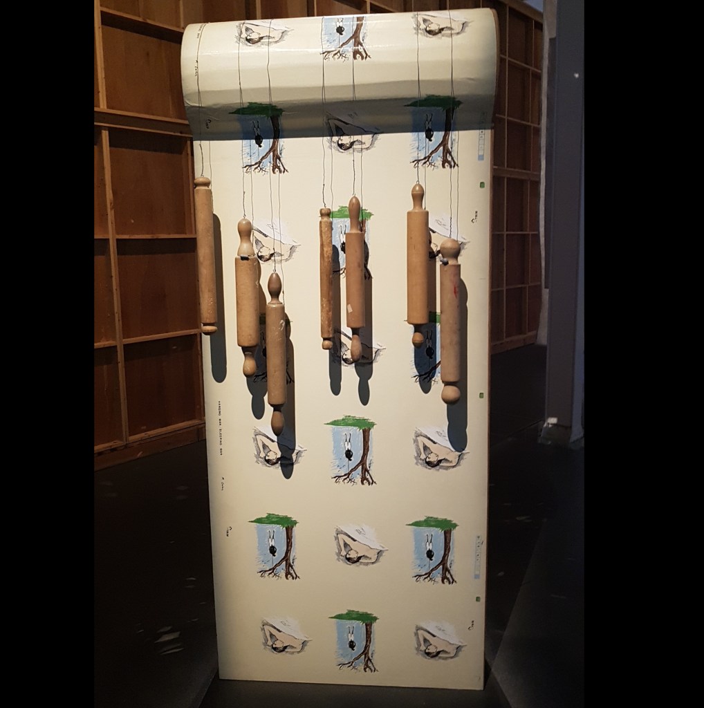 Sin embargo, no puedo dejar de ver en esta pieza los sueños rotos. La estructura en forma de cama se erige en vertical como un monolito ancestral, una lápida funeraria, un tótem que rinde culto a los espíritus, a la vida carnal que se ha ido; mas aun, cuando la obra tiene impresa, por ambos lados, imágenes intercaladas de una persona durmiendo y un ahorcado. El ciervo forrado de cristales rotos bocabajo permanece en equilibrio gracias al contrapeso de los rodillos para amasar pasteles caseros; momentos de juego y vida hogareña, protección y despreocupación colgando de alambres a uno y otro lado de la cama, en una estabilidad precaria por los miedos e incertidumbres.